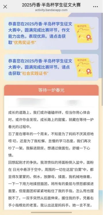 备受岛城学生与家长关注的2025“丹香・半岛杯”学生征文大赛,历经专业严谨的评审,今日正式揭开奖项荣誉!自活动启动以来,大赛以“丹香相伴的温暖时光”为核心,点燃了岛城学子的创作热忱,最终收获超千篇优质参赛作品。孩子们以质朴真挚的笔触、灵动鲜活的表达,将与相关的日常点滴、成长感悟、团圆瞬间娓娓道来,字里行间满是对生活的细腻感知与对亲情的深切体悟,让品牌陪伴的温暖印记愈发深刻。