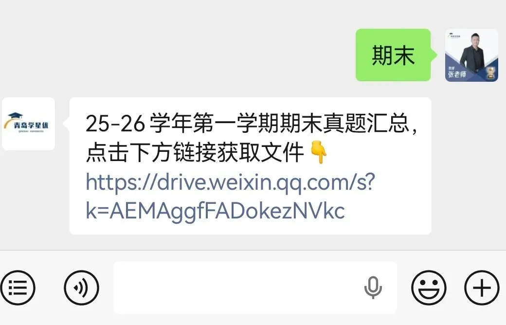 3.编辑并发送“期末”获取五年级到九年级秋季期末真题
