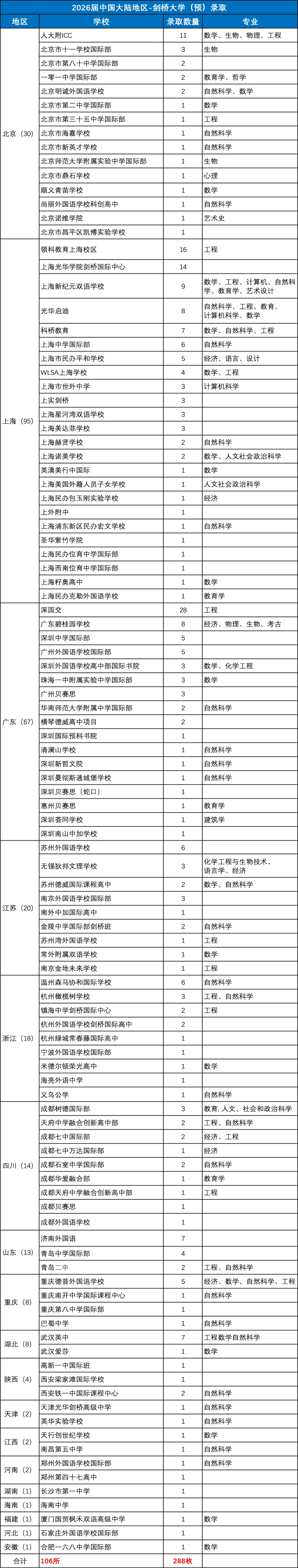 从地域分布来看,录取offer高度集中在以上海、广东和北京为代表的传统教育强省市。其中,上海以95枚录取的绝对优势强势领跑,占全国总量的33%,展现出其在国际化教育领域的深厚底蕴和领先地位。广东紧随其后,获得67枚录取,而北京以30枚录取位居第三。这三地合计斩获192枚offer,占总量的66.7%,构成了中国大陆地区剑桥录取的半壁江山。