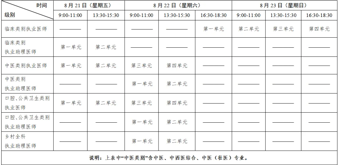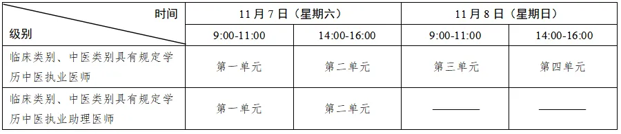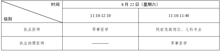 考试实行计算机化考试,军队现役人员、文职人员加试军事医学,院前急救岗位和儿科专业加试相应内容。执业医师合格分数线为360分,执业助理医师合格分数线为180分。统一考试时间如下: