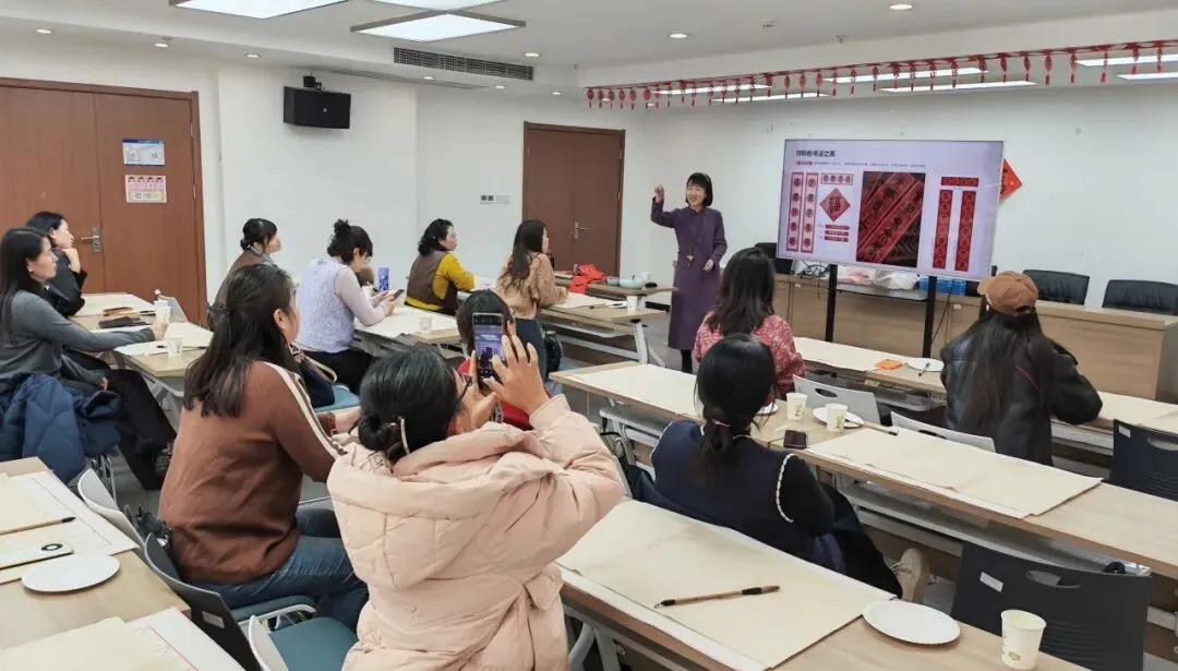 活动伊始,烟台市导游协会妇联主席王姗姗以专业而生动的讲述,引领姐妹们走进“福”字与春联的千年文化长廊。她从甲骨文中的祭祀形态,到秦汉篆隶的演变,再到楷书定型的吉祥寓意,系统梳理了“福”字上百种写法背后所承载的时代故事与民间智慧。一幅幅历代“福”字图例、一段段经典春联典故,在她深入浅出的解读中鲜活起来。现场姐妹们凝神聆听,不时拍照记录,眼神中透出作为文化传播者的求知渴望。这不仅是知识的传递,更是一场文化自信的滋养——未来在带领八方宾客时,她们笔下的山川海韵间,将多一份关于“福”文化的从容讲述。