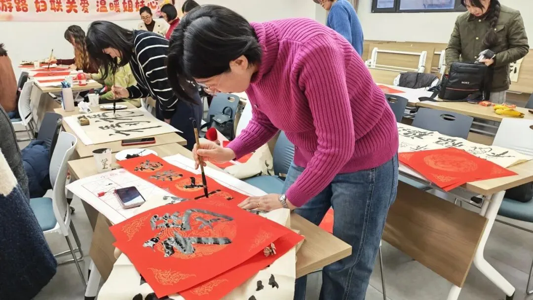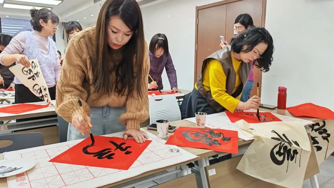 活动现场墨香萦绕、暖意融融,红底黑墨的笺纸将现场点缀得年味十足。姐妹们或俯身凝神、专注运笔,在笔墨间享受沉浸式的宁静;或轻声交流书写心得,分享创作思路,不时传来欢声笑语;完成作品的姐妹还互相展示成果,交流技法,现场热闹非凡。挥毫泼墨间,不仅有中华传统文化的浸润,更有同行姐妹间的温情联结,让这场雅集成为一场兼具文化韵味与情感温度的相聚。