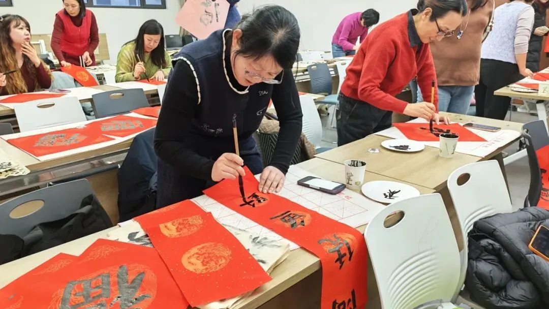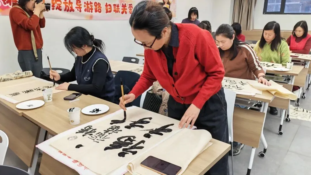 活动现场墨香萦绕、暖意融融,红底黑墨的笺纸将现场点缀得年味十足。姐妹们或俯身凝神、专注运笔,在笔墨间享受沉浸式的宁静;或轻声交流书写心得,分享创作思路,不时传来欢声笑语;完成作品的姐妹还互相展示成果,交流技法,现场热闹非凡。挥毫泼墨间,不仅有中华传统文化的浸润,更有同行姐妹间的温情联结,让这场雅集成为一场兼具文化韵味与情感温度的相聚。
