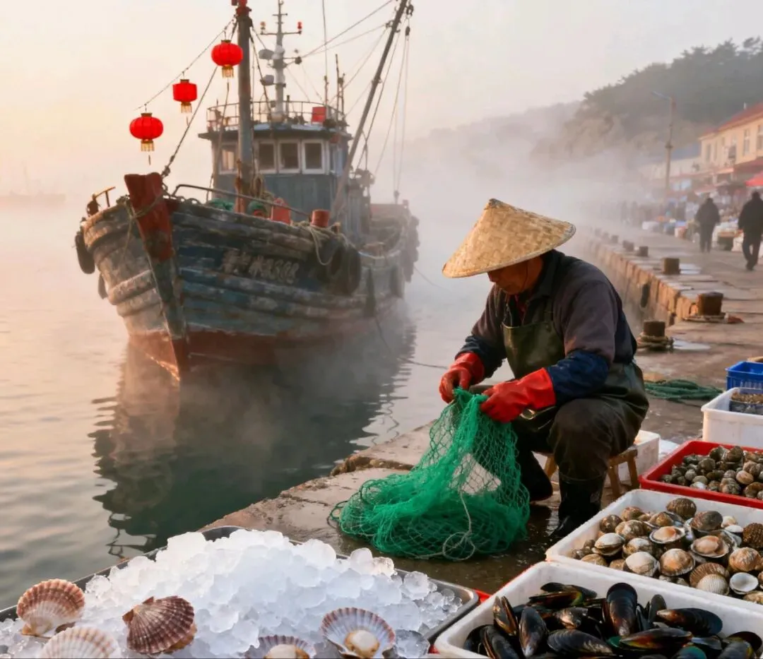 清晨的积米崖渔港,渔船停靠在码头,渔民整理渔网,岸边摆着新鲜海鲜摊,带着淡淡的海雾,烟火气拉满