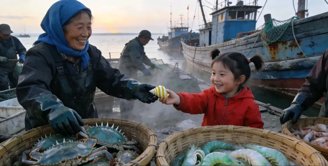 最爱跟着姥姥去积米崖渔港,天不亮守着渔船靠岸,刚捞的梭子蟹、皮皮虾鲜活乱跳,