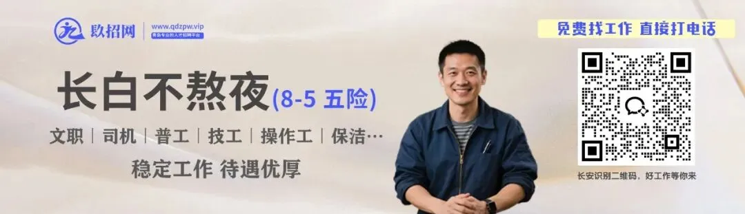 中铁/阡上 普工 7点40-7点半 管吃 五险一金胶南月牙河路做包装袋 非流水工作时间:7:40-19:30 管吃/不管住 单休要求:男女不限,年龄18-52岁,品行端正,身体健康,无犯罪前科;工资:综合工资4000-7000,计件工资,多劳多得;福利:入职五险一金,带薪年休假,外地户口有租房补贴,员工均享受正常节假福利三、入职人员材料准备: 1.身份证原件。报名地址:黄岛区月牙河路270号。(近海天公寓旁)扫码或长按二维码投递简历