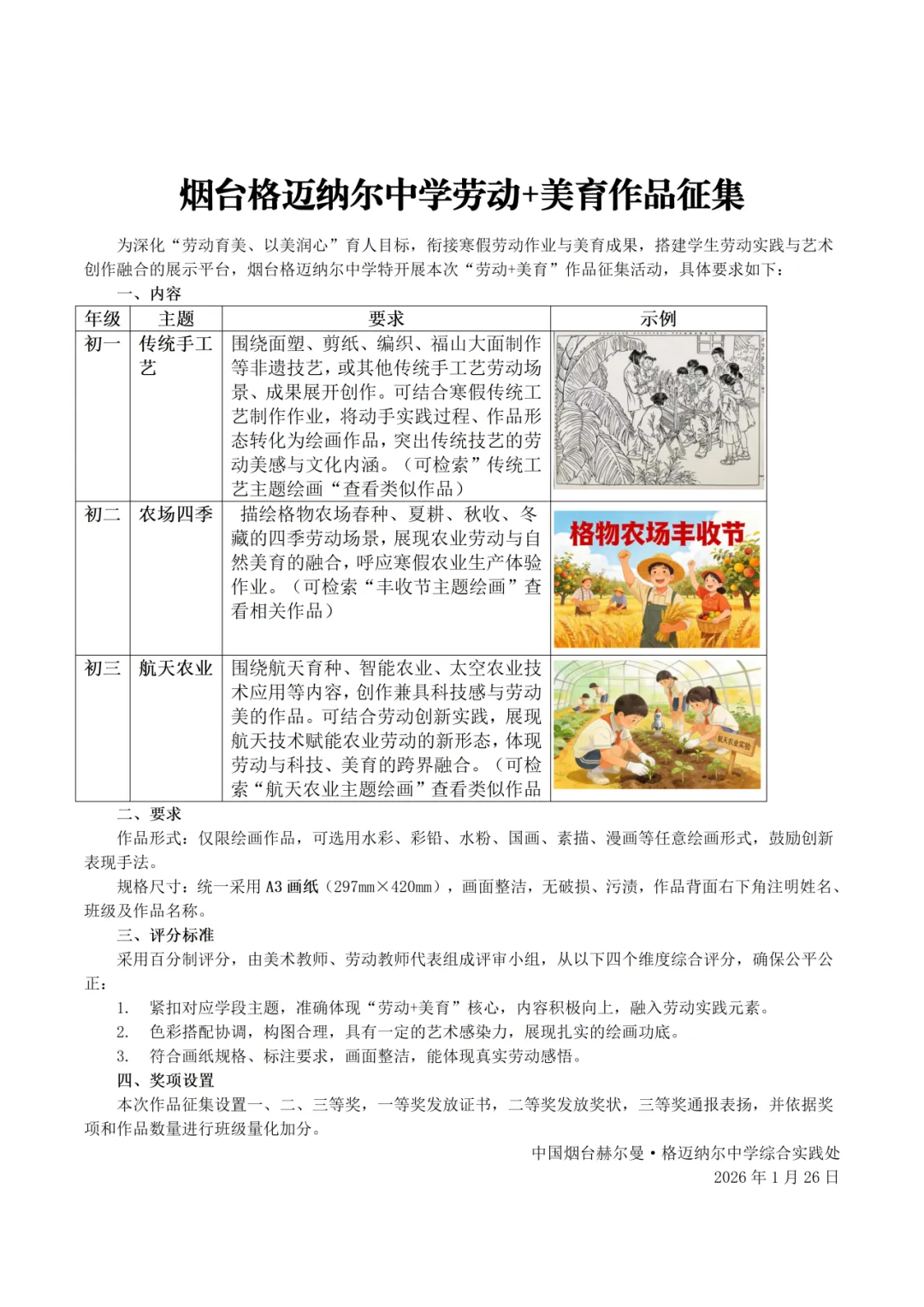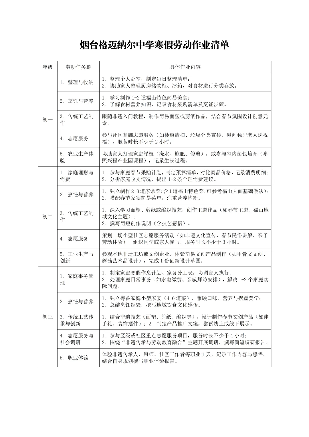 骏马启新程,劳作润芳华。值此丙午马年寒假,春意向暖、年味渐浓之际,烟台格迈纳尔中学以“以劳树德、以劳增智、以劳强体、以劳育美”为初心,特布置本次寒假劳动作业,愿每一位学子都能在烟火气中体悟劳动的价值,在实操实践中锤炼少年的担当。