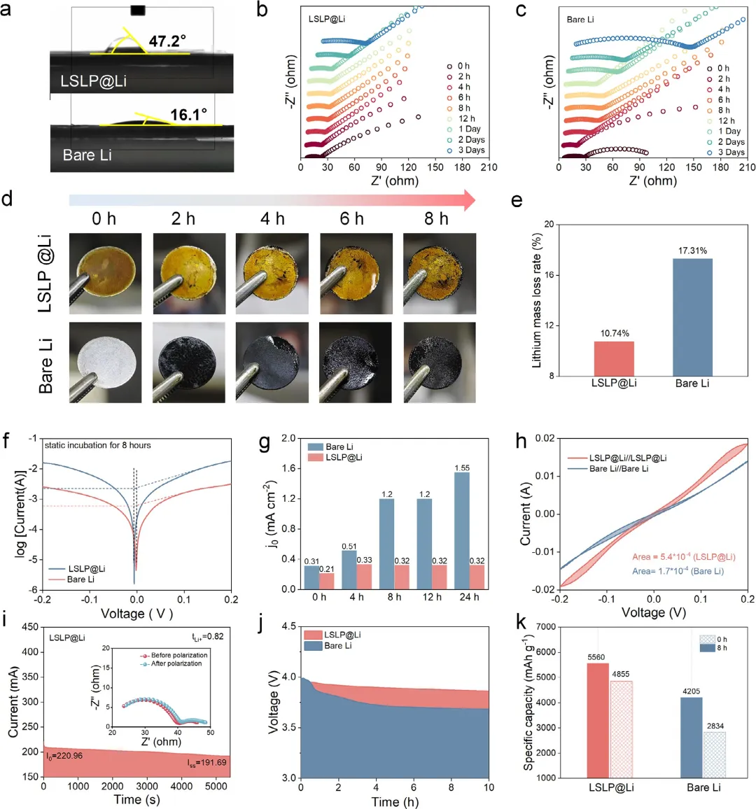 图 2 (a) 电解液在裸锂和LSLP@Li表面的接触角。(b) LSLP@Li和(c) 裸锂电极在不同静置时间(0小时-3天)后的奈奎斯特图。(d) LSLP@Li和裸锂在不同电解液浸泡时间(0-8小时)后的光学图像,显示LSLP保护层的抗腐蚀效果。(e) LSLP@Li和裸锂在不同电解液浸泡时间(0-8小时)后的锂质量损失比较。(f) LSLP@Li和裸锂电极开路静置8小时后的线性极化曲线。(g) LSLP@Li和裸锂电极开路静置0、4、8、12、24小时后的腐蚀电流密度。(h) LSLP@Li/LSLP@Li和裸锂/裸锂对称电池的循环伏安曲线。(i) 通过直流极化和阻抗分析联合测定的锂离子迁移数(tLi⁺)。(j) LSLP@Li和裸锂电极在10小时内的自放电曲线。(k) 不同电极在静置8小时前后初始放电容量的比较。