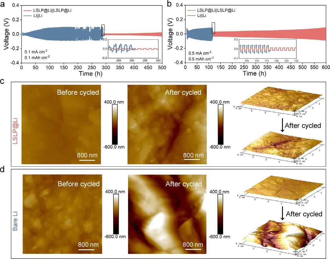 图 3 LSLP@Li/LSLP@Li和裸Li//裸Li对称电池在(a) 0.1 mA cm⁻²、0.1 mAh cm⁻²和(b) 0.5 mA cm⁻²、0.5 mAh cm⁻²下的循环性能。原子力显微镜(AFM)表征:(上图)平面图和(下图)(c) LSLP@Li和(d) 裸锂在循环前和循环后的截面形貌。