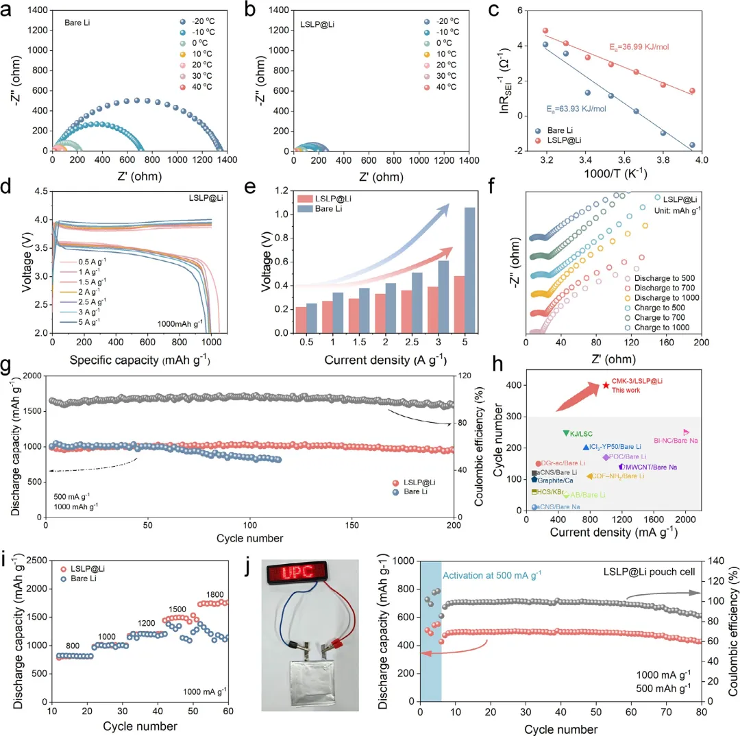 图 5 (a) LSLP@Li电池和(b) 裸锂电池在温度从-20°C升至40°C时的奈奎斯特图。(c) 根据温度依赖性EIS数据计算得出的LSLP@Li电池和裸锂电池的活化能。(d) LSLP@Li电池在不同电流密度下的充放电曲线。(e) 不同电极在不同电流密度下的充放电极化。(f) LSLP@Li电池在不同充放电状态下的原位EIS。(g) 裸锂电池和LSLP@Li电池在500 mA g⁻¹下的循环性能。(h) 已报道Cl₂电池研究中的循环次数和电流密度比较。(i) 不同截止容量下的循环性能。(j) LSLP@Li软包电池的光学照片及长期循环性能。