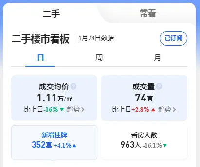 据贝壳1月28日青岛二手房成交数据,二手房成交均价为1.11万/㎡,环比前一日大跌16%;二手房成交74套!新增挂牌352套。该二手楼市看板数据显示,市场呈现“价跌量增”的分化态势。1月28日成交均价为1.11万元/平方米,较上日大幅下降16%,反映出价格下行压力明显。成交量则小幅上升2.8%,达74套,显示在价格调整背景下,部分购房者选择入市。新增挂牌量352套,增长4.1%,表明卖方出货意愿增强,市场供应继续增加。然而,看房人数仅为963人,同比下降16.1%,反映潜在购房需求观望情绪仍浓,市场整体活跃度不足。综合来看,二手房市场正处于价格调整与交易结构重构阶段,买卖双方博弈持续,短期内或延续“以价换量”趋势。房价方面,去年跌得确实“拉垮”,但今年开年,那种自由落体式的下跌算是刹住了车。虽然仍有房东在降价,但力度明显温柔了许多。甚至有些小区成交价已经稳如老狗,比如浮山后、银丰那几个盘,价格跟年前差不多。这说明,市场起码有个“底盘”在撑着。