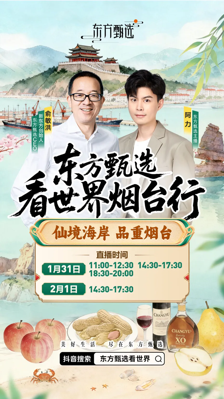 近日,东方甄选官方公布,俞敏洪、主播阿力将于1月31日至2月1日走进山东烟台,沉浸式体验、解锁烟台的山海浪漫与人间烟火,并通过东方甄选App以及“东方甄选看世界”、“东方甄选诗酒人生”抖音直播间同步开播。