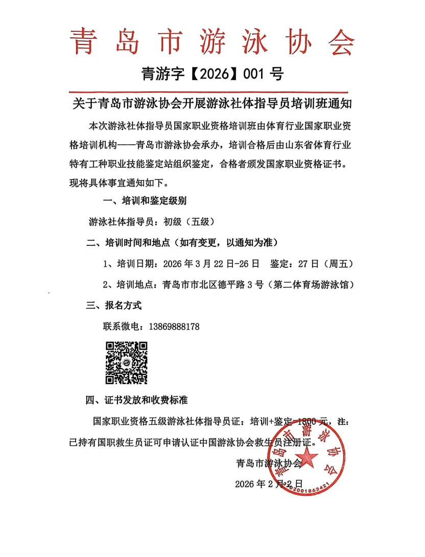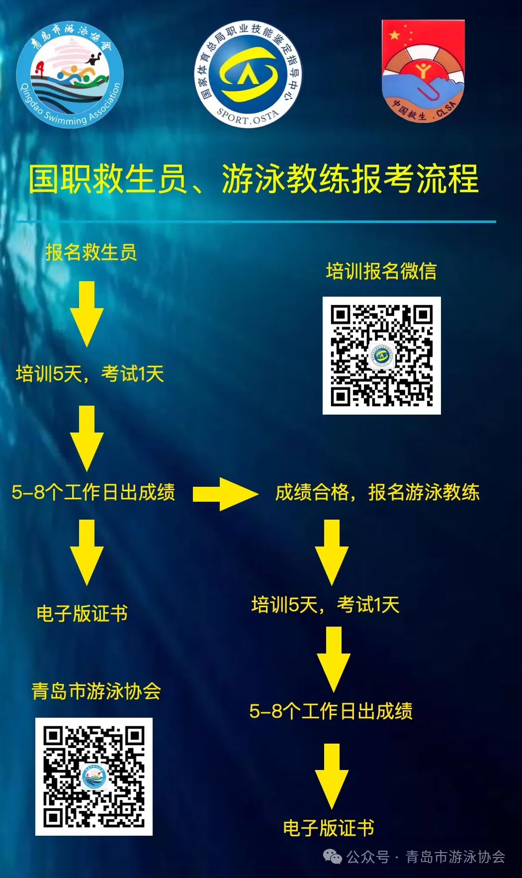 为各大游泳场馆提供更专业的教学人才,本次游泳社体指导员国家职业资格培训班由体育行业国家职业资格培训机构——青岛市游泳协会承办,培训合格后由山东省体育行业特有工种职业技能鉴定站组织鉴定,参加培训、考试成绩合格者将颁发国家职业资格五级游泳社体指导员证书,具体通知如下: