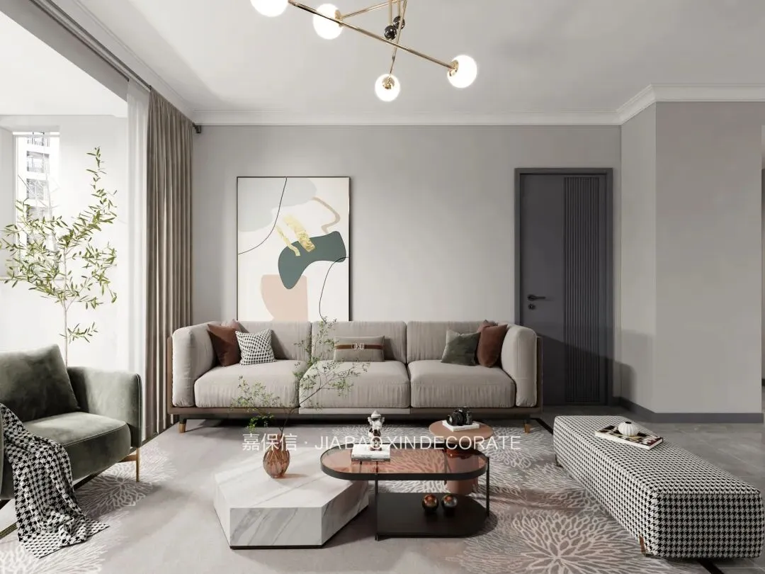 沙发墙以大幅抽象画作为点缀,把艺术感融入日常起居。灰色布艺沙发、绿色丝绒单人沙发、千鸟格纹坐垫与不规则形状的茶几灵活搭配,营造出层次丰富的视觉效果。角落里的绿植与茶几上的插花巧妙呼应,为空间注入几分自然的生机。
