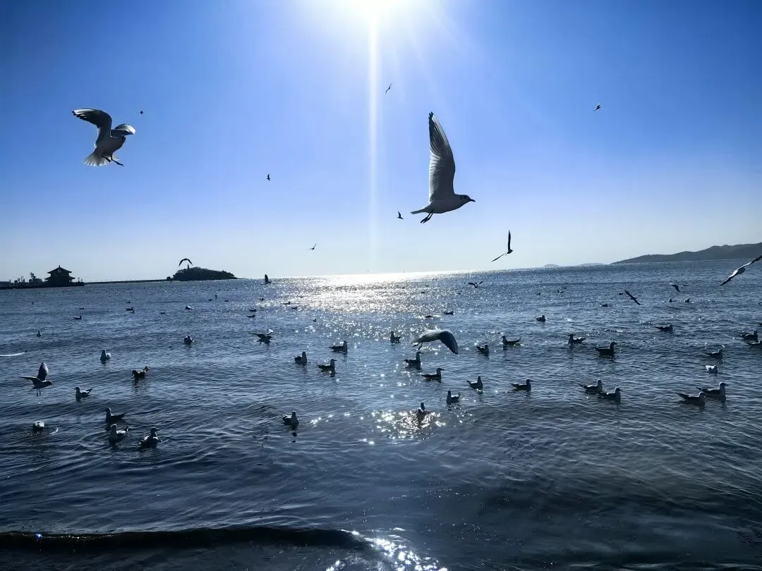 到了栈桥,我的眼前更亮了。海岸线更长,海鸥更多,人群攒动,热闹极了。有了比较,心情就更加激动:远处的海面波光粼粼,蓝得澄澈又辽阔,而最动人的,是漫天翩飞的海鸥,让人的心头热乎乎的。那些海鸥舒展着翅膀,在海面上盘旋、低飞,偶尔掠过游人的肩头,衔走掌心的面包,发出清脆的鸣叫。我发现投喂或者用食物吸引海鸥的现象非常频繁,这是我第一次见这么多的海鸥,它们就像一簇簇灵动的音符,点缀在蔚蓝的幕布上,让寂静的海有了鲜活而灵动的气势。海鸥似乎不惧怕人群,而是故意与游客嬉闹、逗乐,仿佛一幅迎客图,舒展在天空,海面上,我举起手机,拍了不少的图片,把欢乐的海鸥展翅的瞬间拍了下来,海天一色的辽阔,海风吹过耳边,丝毫没有寒冬的凛冽刺骨,倒是呈现出一种温柔,海味的气息夹杂其中,让青岛栈桥充满最明亮的底色。