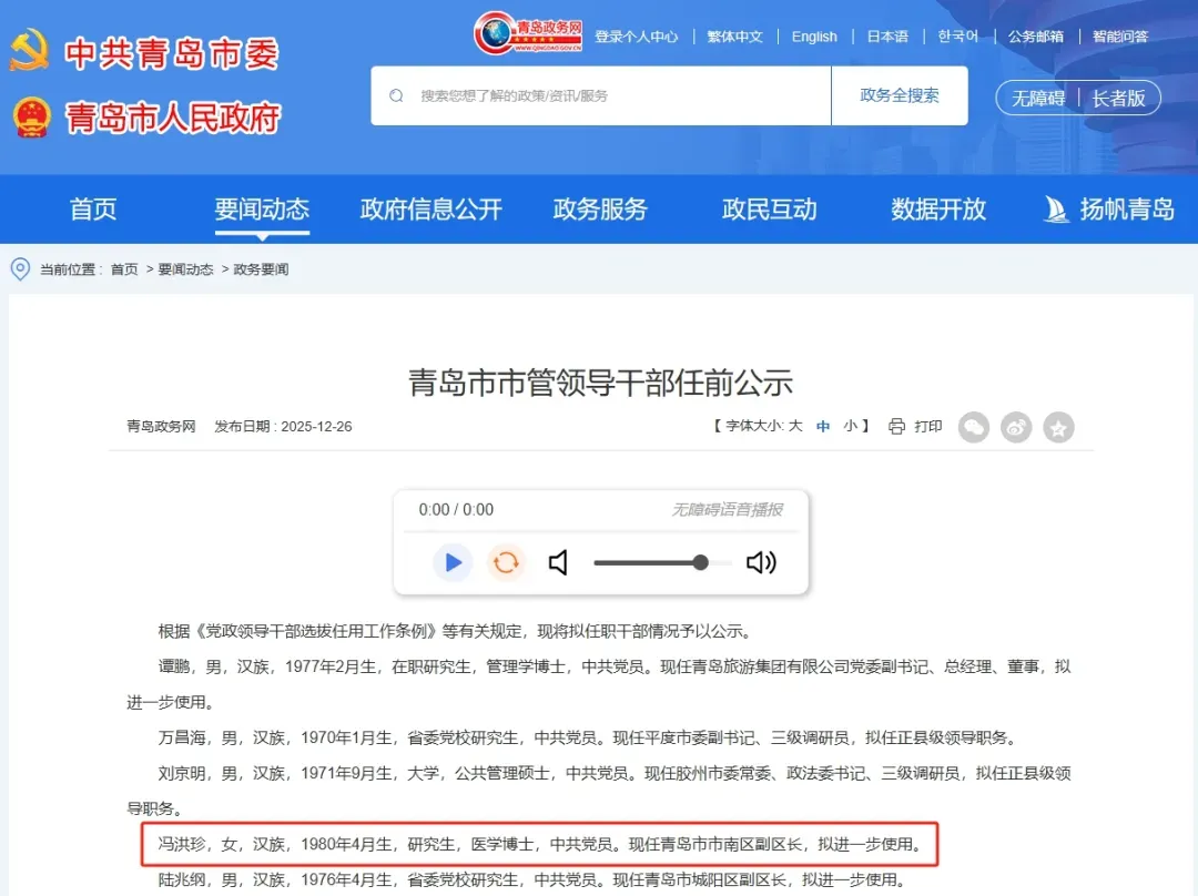 2025年12月,中共青岛市委组织部发布《青岛市市管领导干部任前公示》,其中,“冯洪珍,女,汉族,1980年4月生,研究生,医学博士,中共党员。现任青岛市市南区副区长,拟进一步使用。”