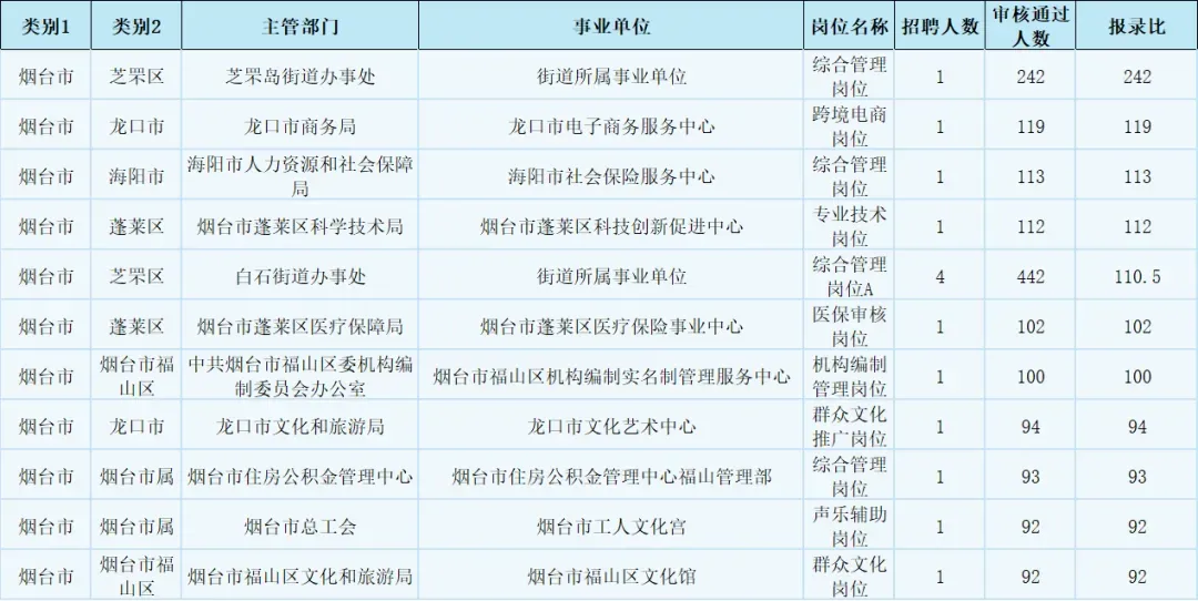 烟台报名审核竞争比较高前十岗位