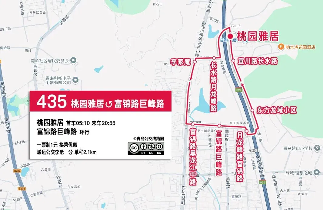 自桃园雅居站,沿宜川路、青银高速西侧无名路、长水路、黑龙江中路、富锦路至富锦路巨峰路站后,沿富锦路、月龙峰路、青银高速桥下无名路、宜川路至桃园雅居站。