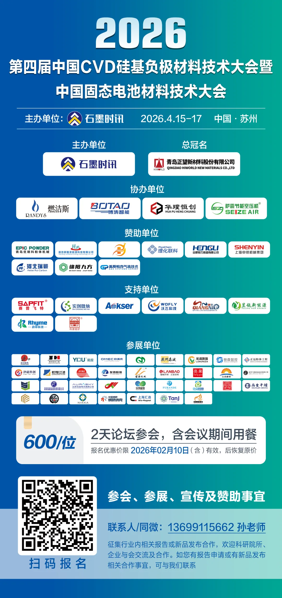 由石墨时讯主办的2026第四届CVD硅基负极材料技术大会暨固态电池材料技术大会将定于4月15-17日在苏州召开。会议重点聚焦固态电池和硅基负极两大热点,直面低成本和高性能化两大核心诉求,从原料选材、结构调控、界面设计、电池工程化技术和装备、先进表征与失效分析、计算模拟与AI赋能等角度,邀请顶尖专家学者、知名企业家和资本界人士,分享创新成果,探讨深度合作,聚力技术突破,产业链升级,助力商业化加速。