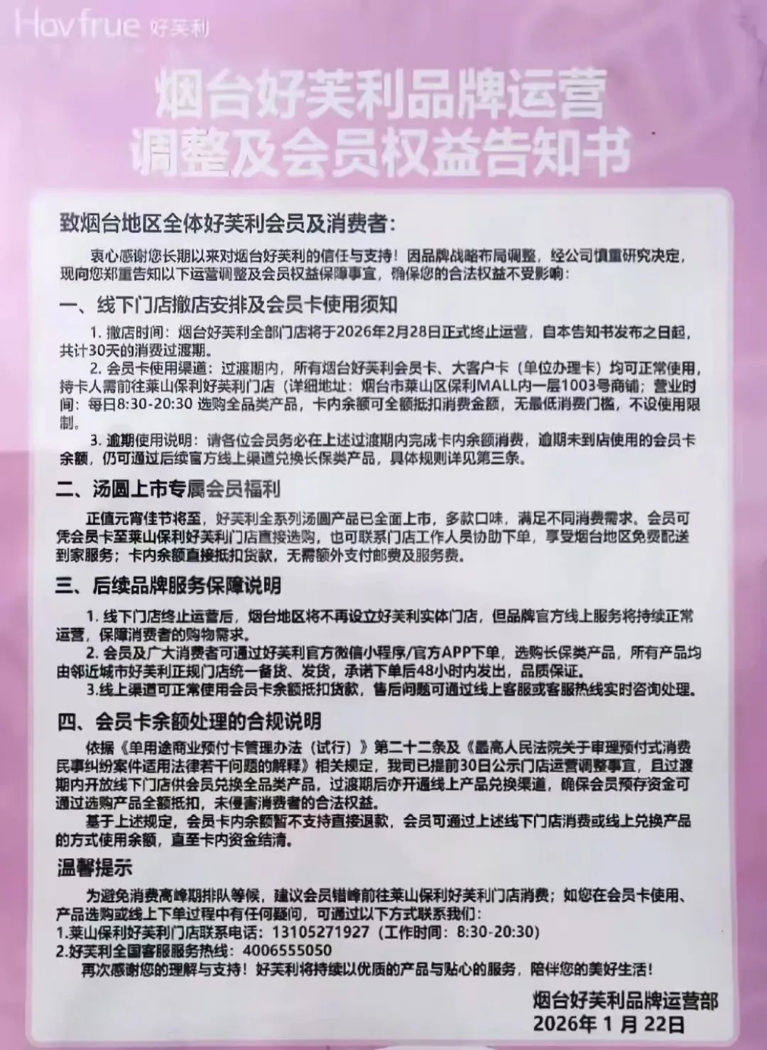 1月22日,好芙利官方发布了闭店通知,该通知中表示,烟台好芙利全部门店将于2月28日终止运营,消费者将有30天的消费过渡期。