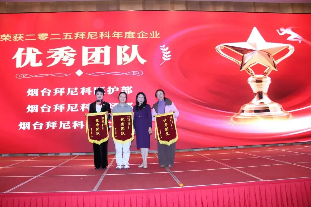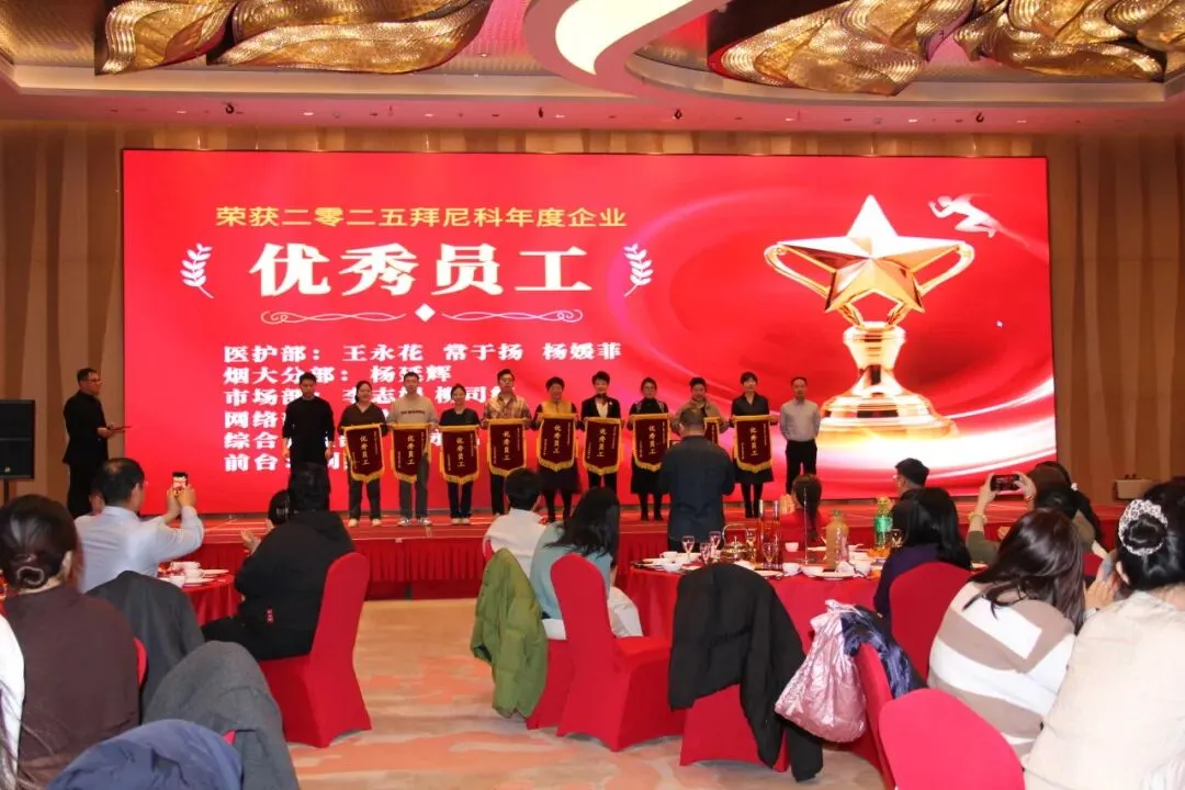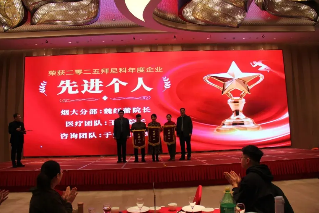 随后,大会迎来了激动人心的年度表彰环节,孙院长上台,对2025年度工作进行了全面而深刻的总结。从技术突破到服务升级,从团队建设到社会责任,每一份成绩单都凝聚着拜尼科人的智慧与汗水。孙院长表示,正是每一位员工的默默奉献,铸就了拜尼科在烟台口腔医疗领域的坚实口碑。灯光璀璨,音乐激昂,一批在2025年度表现突出的优秀团队与个人依次走上荣耀的舞台。