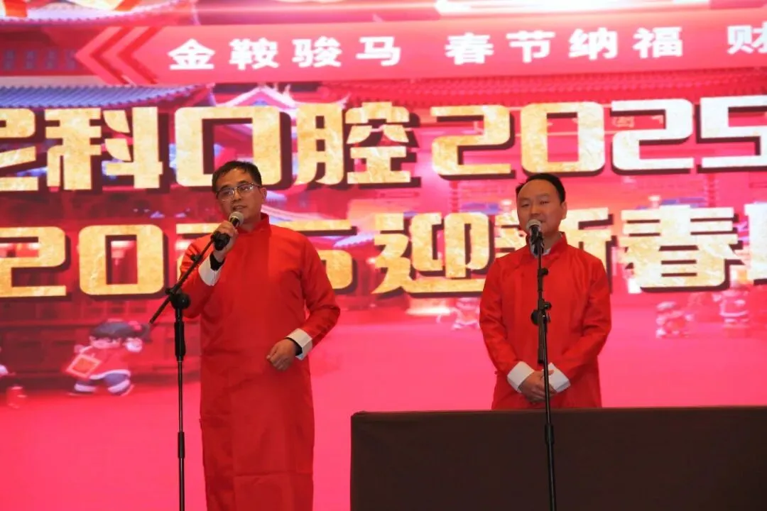 晚会伊始,主持人上台开场后拜尼科口腔郑董事长登台致辞。她深情回顾了过去一年全体同仁携手并进的奋斗历程,对大家在医疗技术、服务质量、患者口碑等方面取得的卓越成就给予了高度肯定,并对拜尼科口腔的老朋友天启艺术团表示热烈欢迎。郑董事长的话语铿锵有力,点燃了全场的热烈掌声。她勉励大家在新的一年里,继续秉承“精诚、匠心、仁爱”的价值观,为烟台百姓的口腔健康保驾护航。