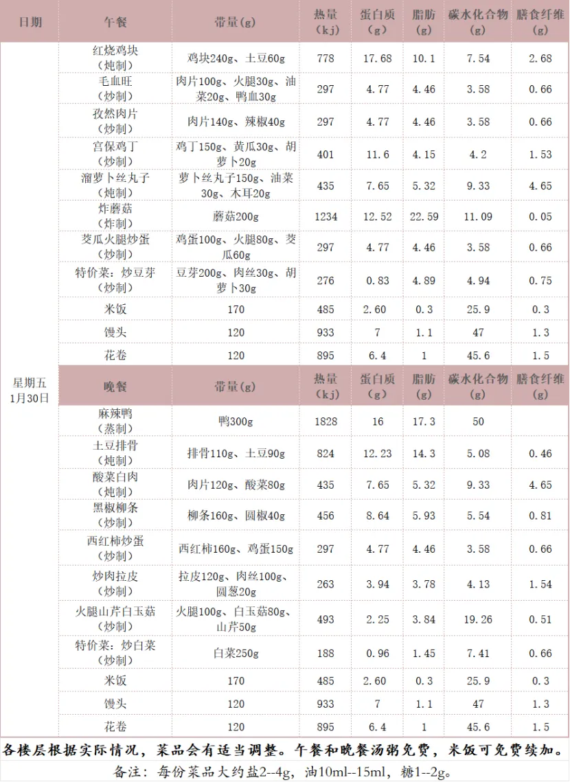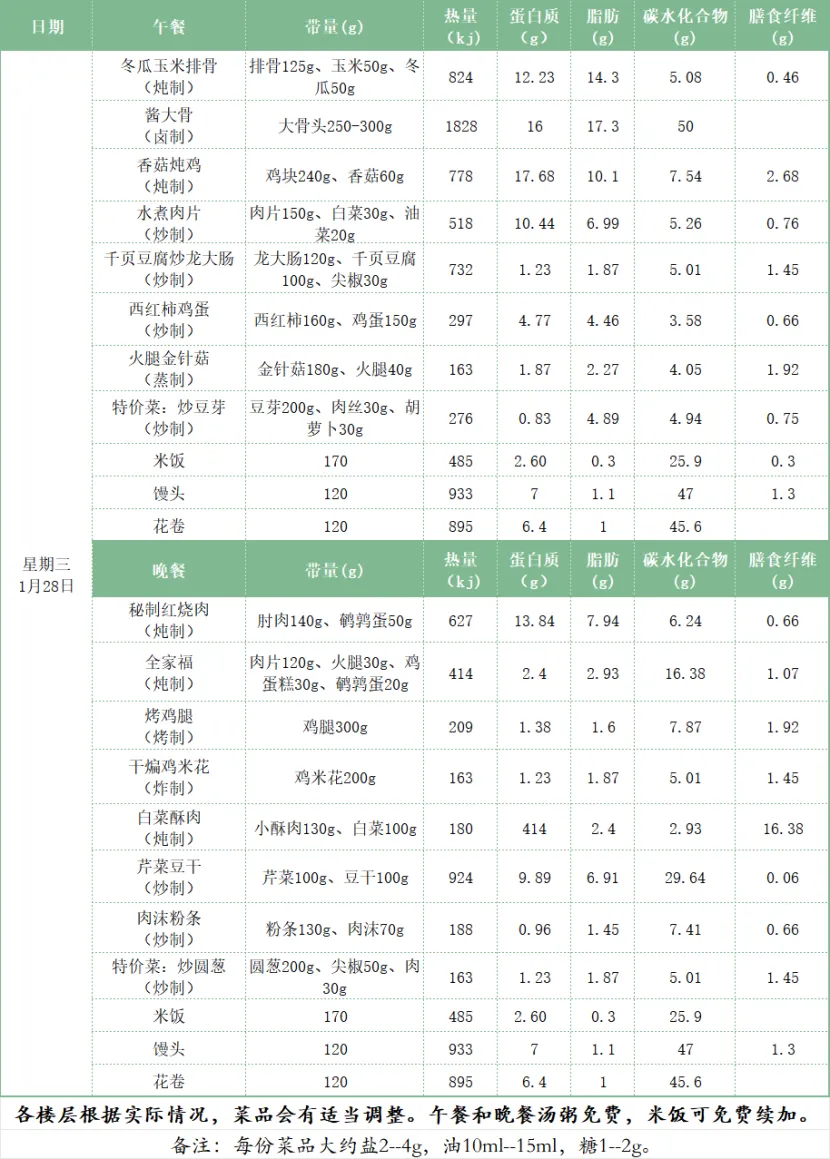 本周灶台依旧温热,食材鲜选优烹,热粥暖汤驱散寒意,荤素搭配补足能量,全力守护师生冬日饮食健康。愿这一周的每一餐暖意,能消解期末收尾的疲惫,也为即将到来的新春积攒满满元气。