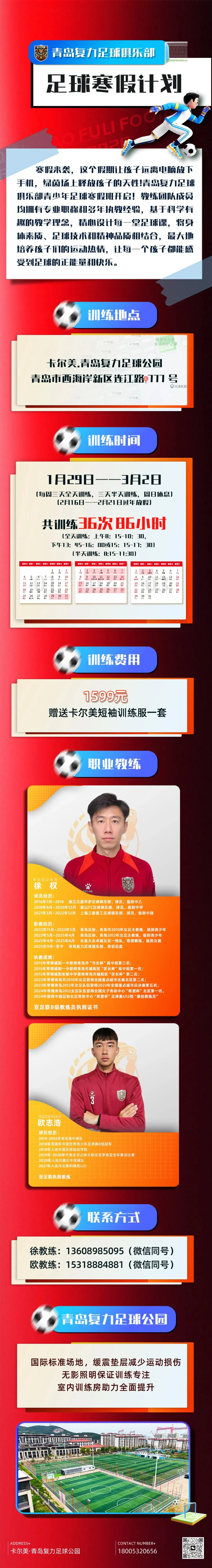青岛复力足球俱乐部青少年足球寒假集训营正式开班了,36个课次共计86小时的集中训练,包含青少年足球技战术水平的优化提升及不同年龄段、不同层次水平的足球专项教学,并且还有精美足球装备赠送。孩子爱踢球,又有家长的支持,才是孩子最幸福的时刻。足球技能的培养,不仅仅是对孩子体育专项的提升,更能健全孩子的德智体全面发展,塑造孩子坚韧不拔勇争上游的珍贵品质。期待用一个寒假的周期,打造出全新的自己。快来报名参加青岛复力青少年足球寒假集训营吧。