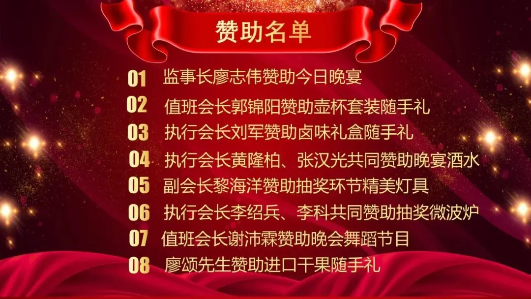 联谊会的成功举办,离不开众多会员乡亲的鼎力支持与慷慨赞助。监事长廖志伟赞助了情意满满的晚宴;郭锦阳、刘军、黄隆柏、张汉光、黎海洋、李绍兵、李科、谢沛霖、廖颂等会长及老乡赞助了丰富的随手礼、酒水、奖品及精彩节目。这份“人人为商会、商会为人人”的无私精神,是商会最温暖的底色。