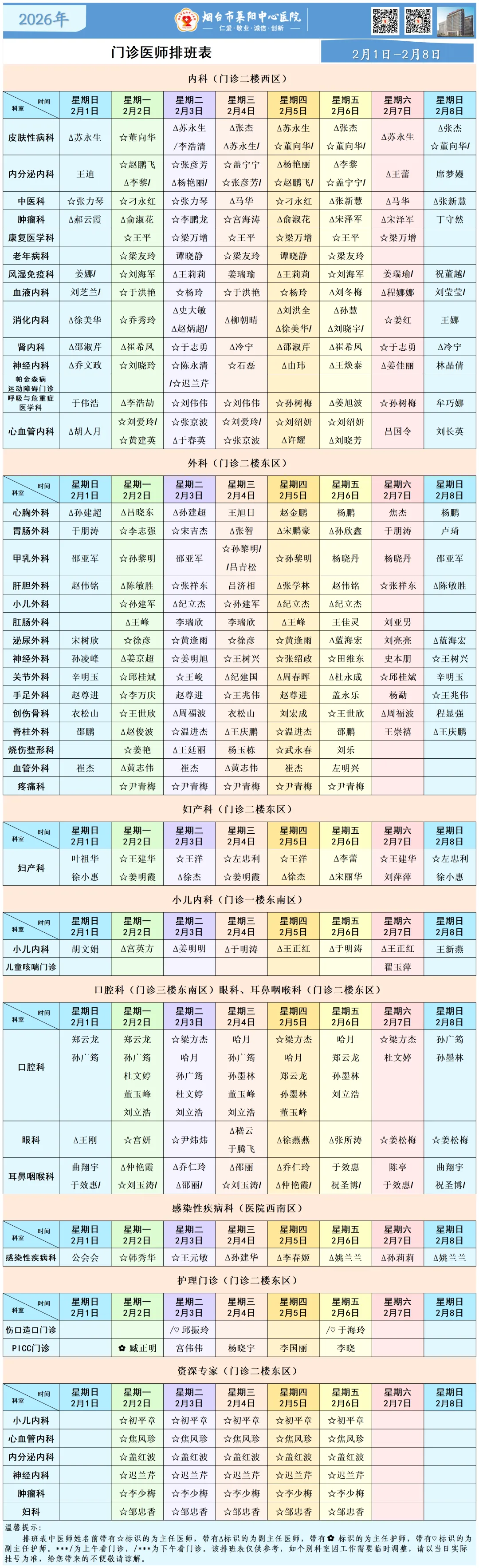 为了更好的方便市民朋友就诊,烟台市莱阳中心医院每周推出《门诊医师排班表》,市民朋友可根据需求查看医师坐诊时间,预约挂号,错峰就诊。就诊时请携带身份证、医保卡、就诊卡或电子健康卡。天气变化,注意增减衣物,戴好口罩,保持间隔距离。