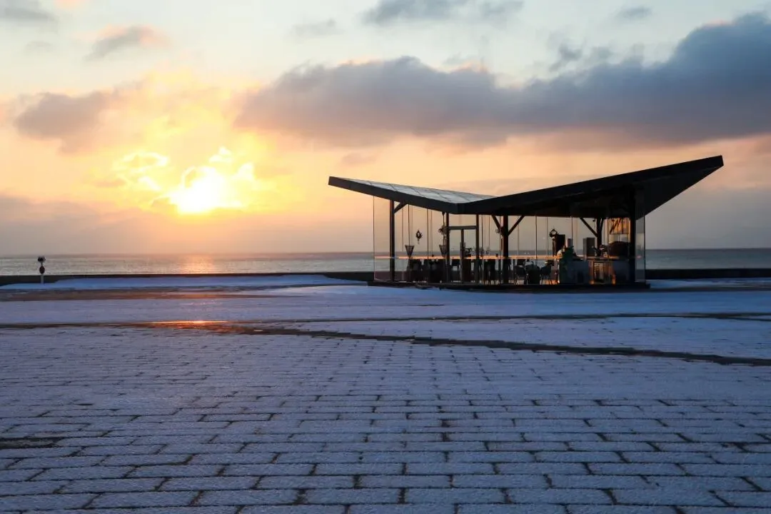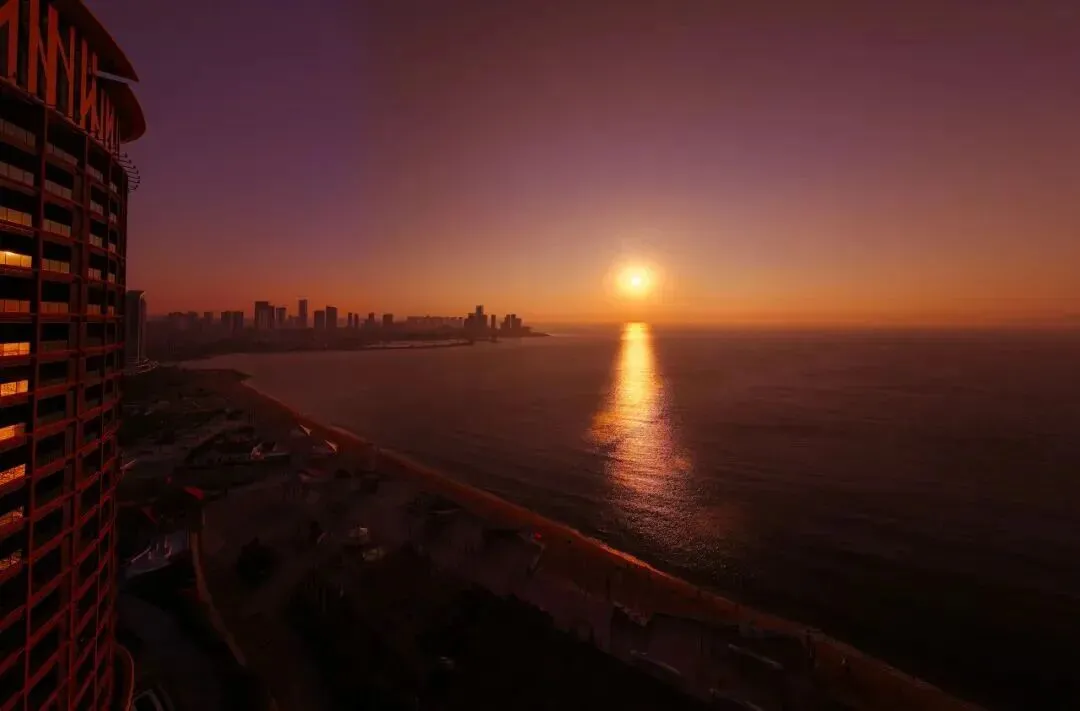 傍晚夕阳沉入海平线,天空泼洒金橘色油彩