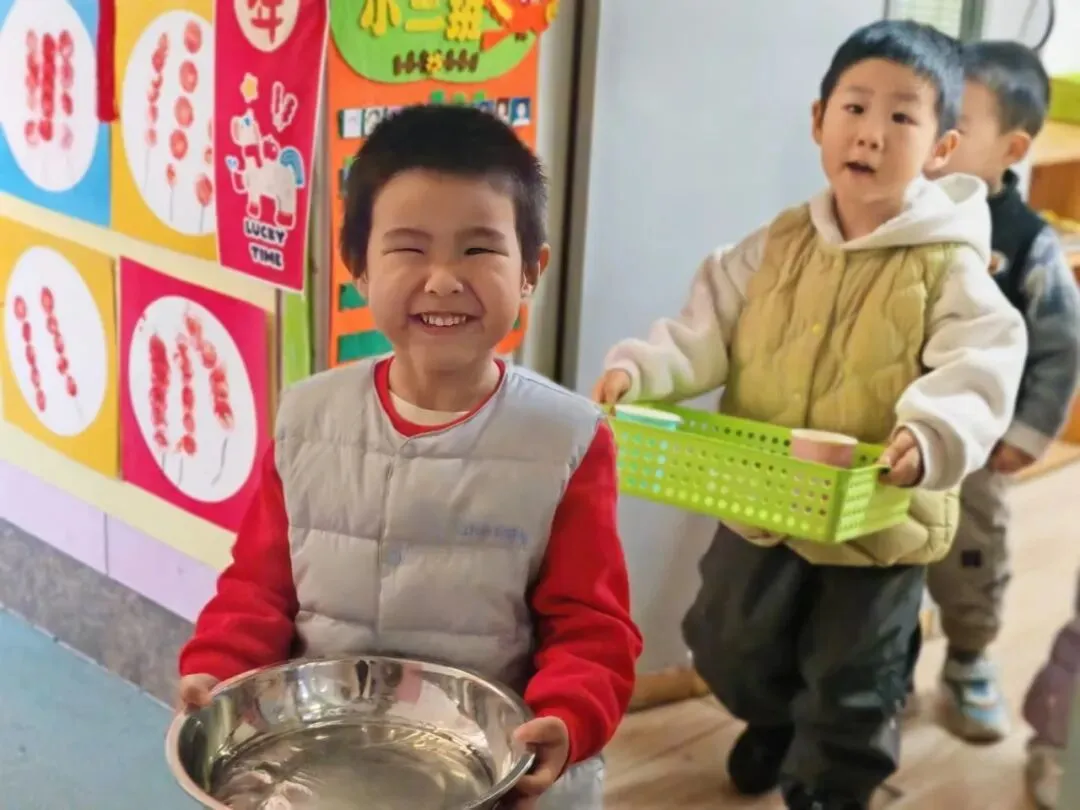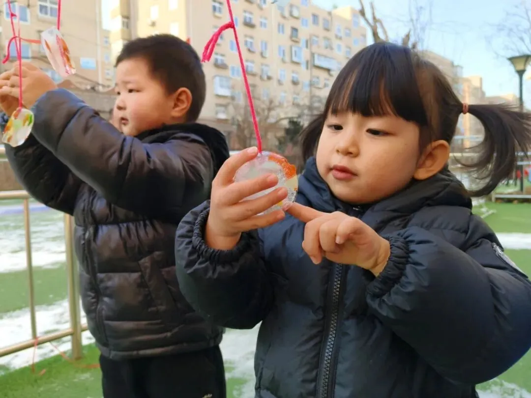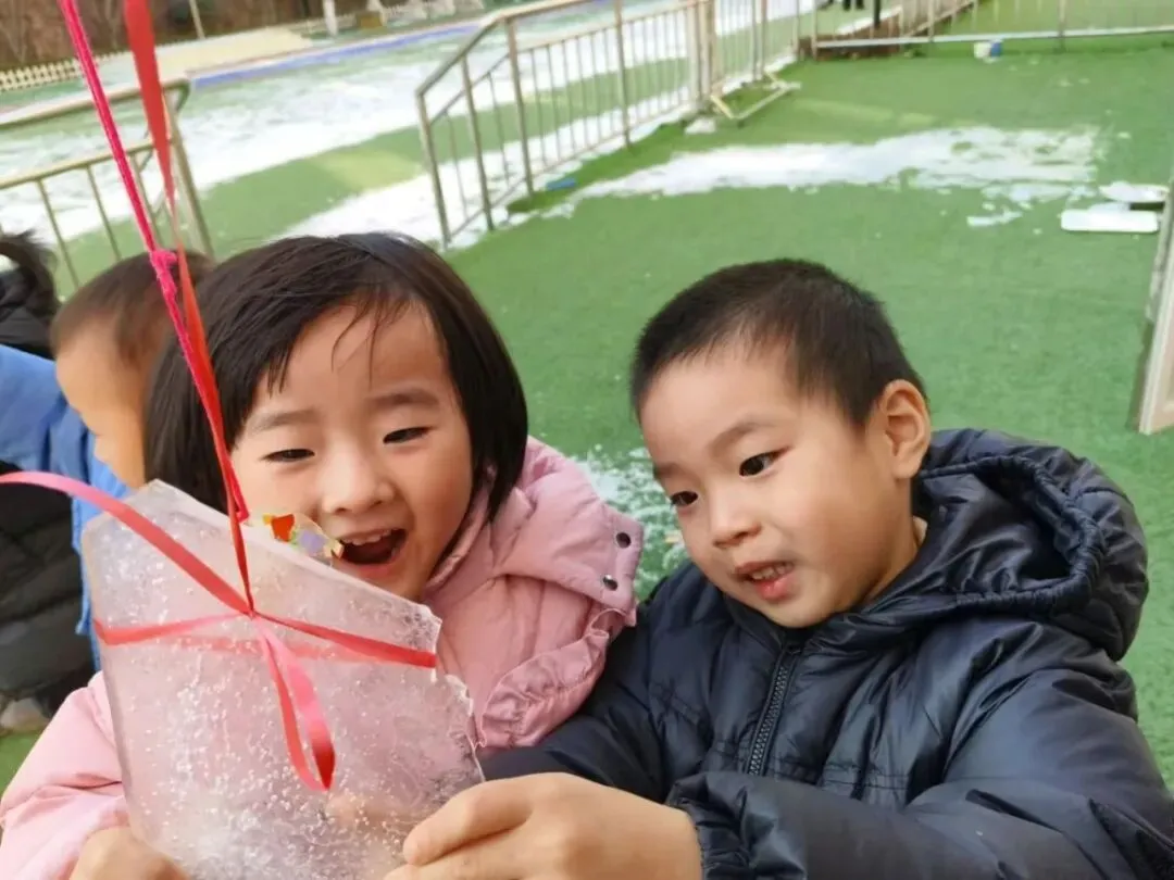 离园前,我们一起在院子里放好了装水的容器,期待夜晚的低温施展“魔法”。第二天早晨,当大家发现容器中果然出现了亮晶晶的冰块时,都兴奋地欢呼起来:“我做的冰成功啦!”