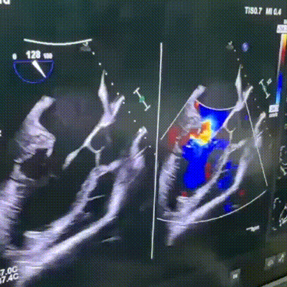 食道超声示长轴界面泵头基本对着二尖瓣,调节辅助装置的泵速,证实血流方向正常,流速可。