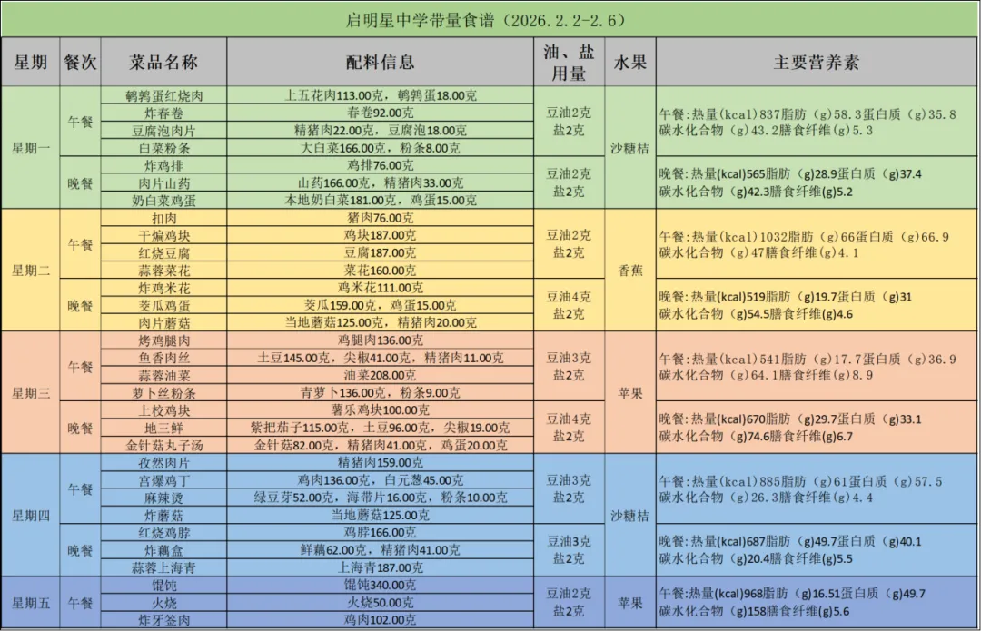 青岛启明星中学一周食谱(2026.2.2-2.6)