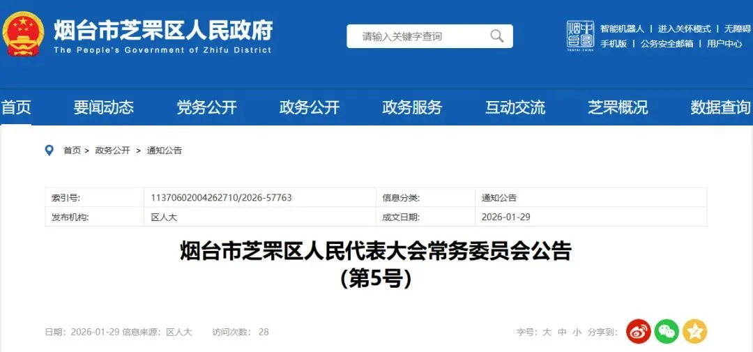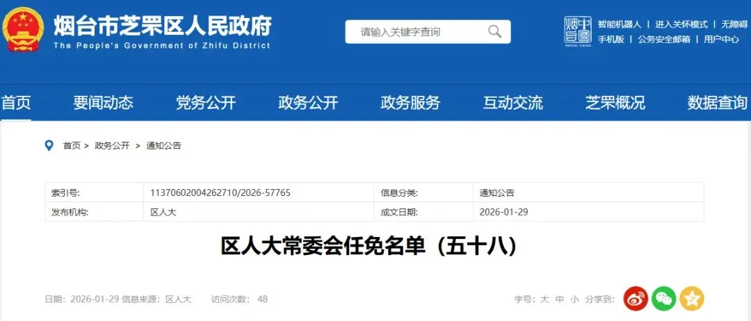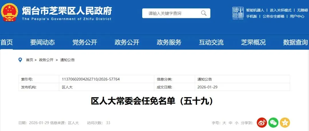 烟台市芝罘区第十九届人大常委会第三十六次会议,根据区人民政府区长宋军委的提请,于2026年1月29日决定任命: