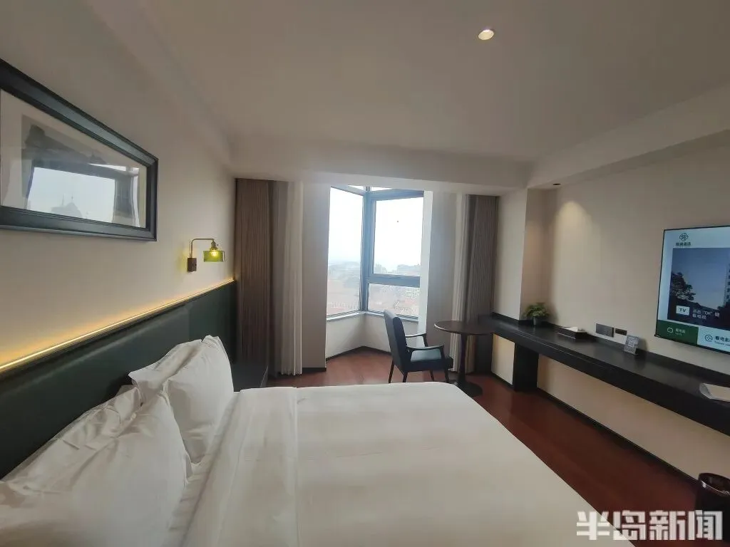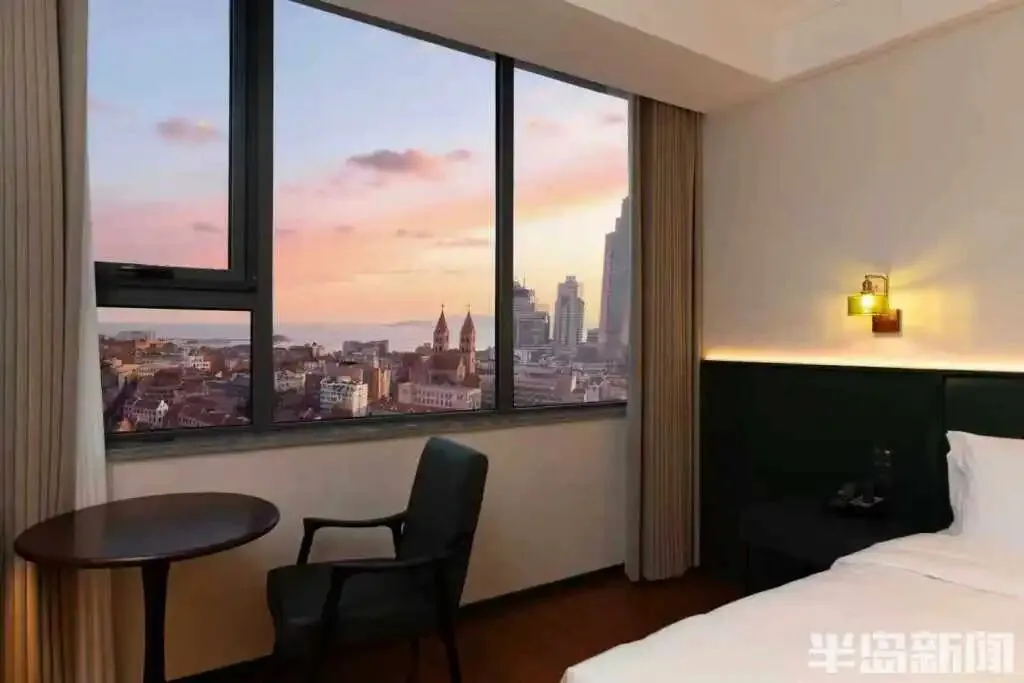 在酒店客房窗边向南远眺可以看海,脚下的大鲍岛文化休闲街区、不远处的上街里,青岛历史城区风貌尽收眼底。
