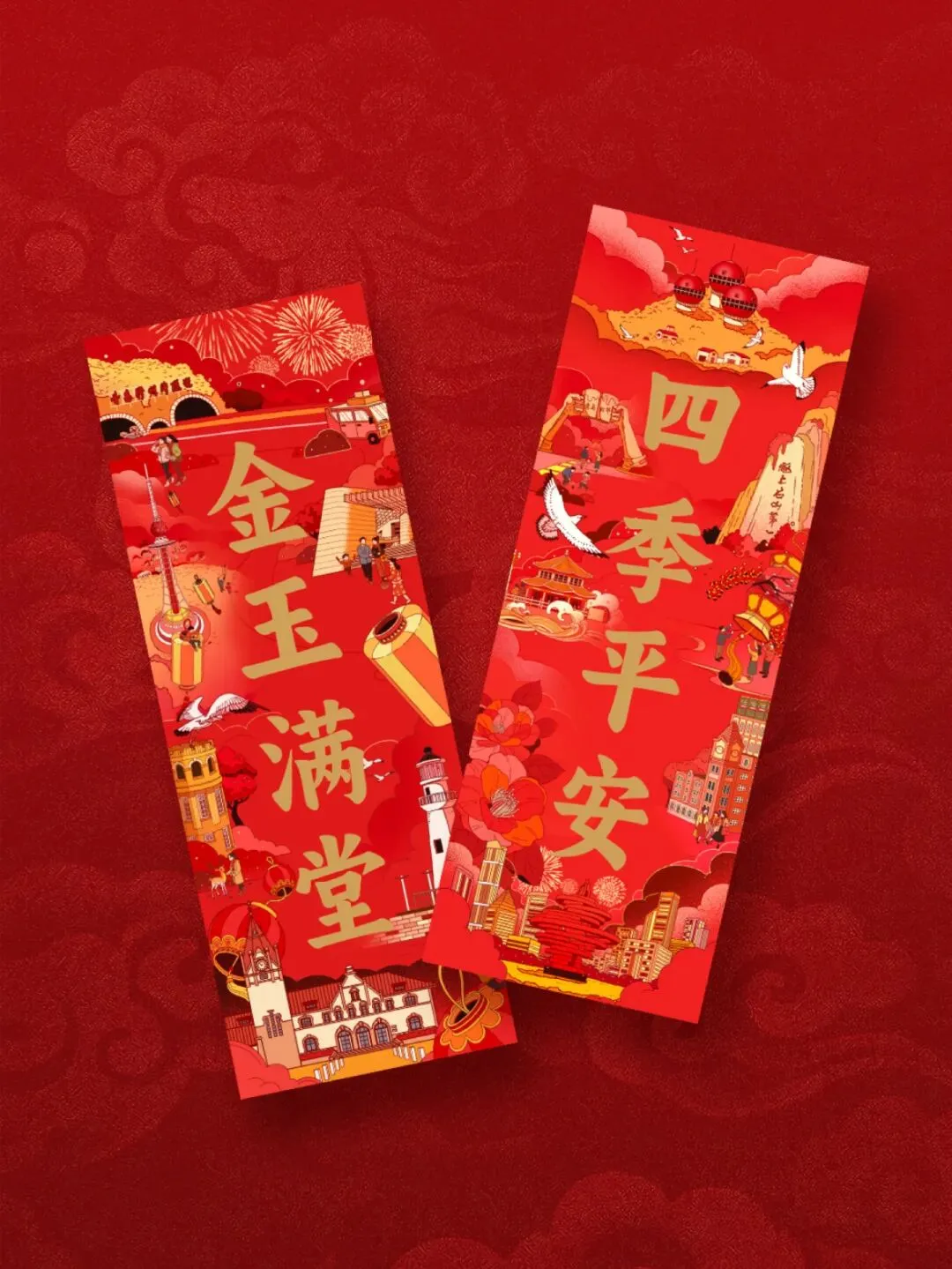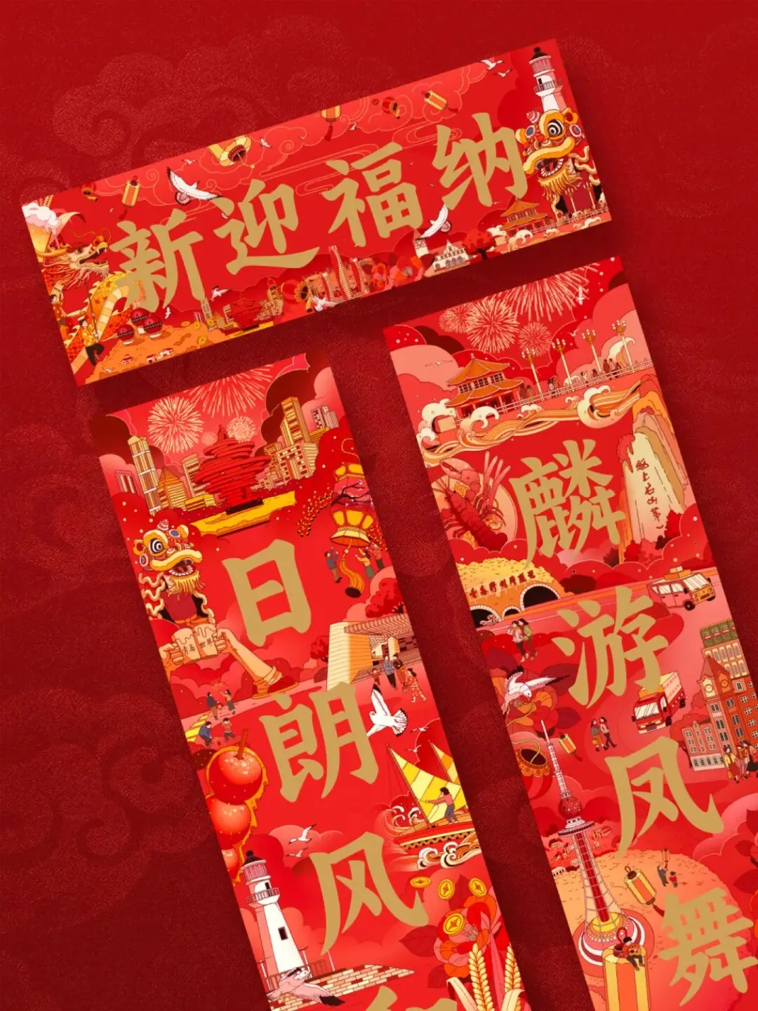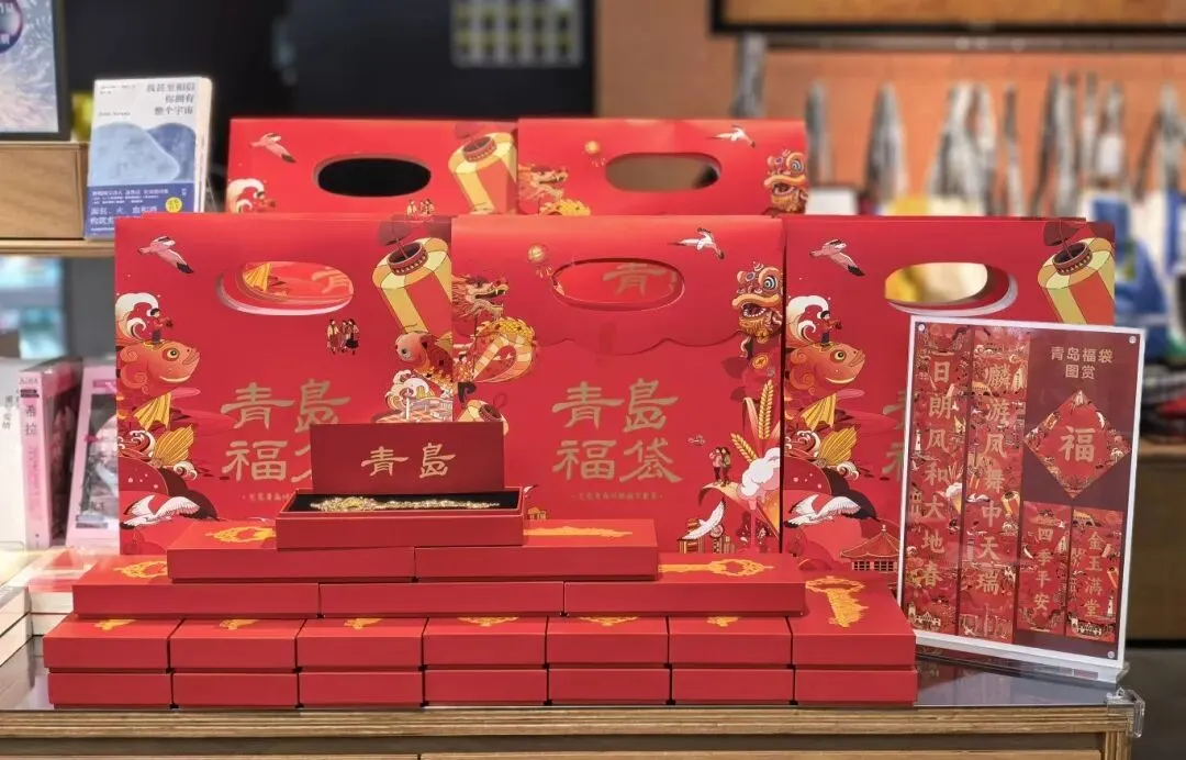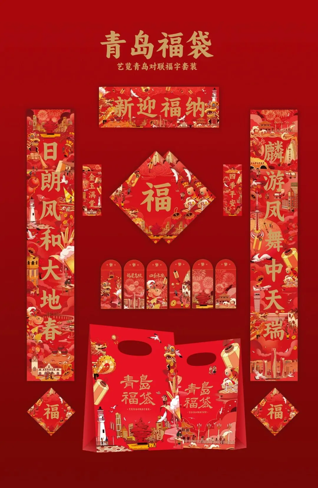 青岛福袋·艺览青岛对联福字套装,以喜庆红金为主色调,将海滨城市的独特韵味与新春热闹氛围完美融合,内含对联、春条、福字、红包、窗花五大品类,是兼具收藏与实用价值的春节好物。