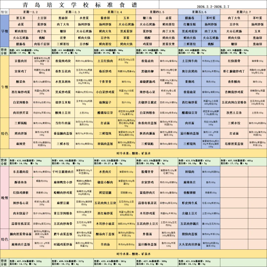 青岛培文学校按照每日膳食推荐摄入量