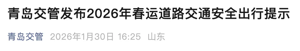 2026年春运自2月2日(腊月十五)起,至3月13日(正月二十五)结束,共计40天。其中,2月15日(腊月二十八)至2月23日(正月初七)是春节假期,共9天,高速公路继续实行免费通行政策。青岛公安交管部门结合往年春运期间交通出行规律和道路交通事故特点,对2026年春运交通安全形势进行分析研判,发布交通安全出行提示。