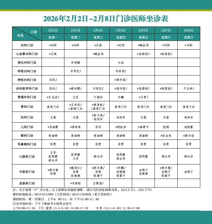 烟台高新技术产业开发区医院2026年2月2日—2月8日门诊医师坐诊表及专家信息