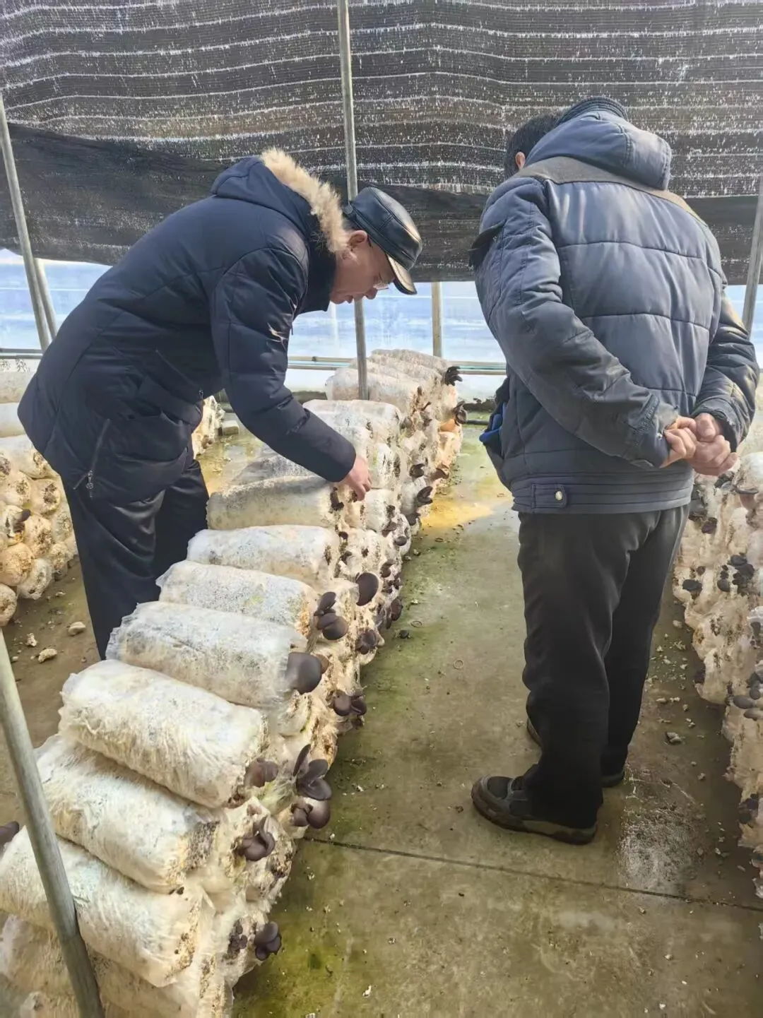烟台九色农业科技发展有限公司成立于2023年,有出菇大棚6个,企业以平菇种植为主。2026年1月22日烟台试验站王鸿磊站长和丁强实地查看了企业的平菇生产情况,针对企业技术薄弱、菇棚设施结构不合理等情况,王鸿磊站长建议其一是利用白天尽可能提升棚温;二是减小通风口、下午日落前1.5-2小时降下保温被减少热量损失;三是同时根据天气情况减少喷水或者不喷水,特别是不能喷“关门水”;四是及时处理残留菇根,防止产生病害,特病黄萎病的发生和蔓延;五是菇棚取暖要做好防火措施。
