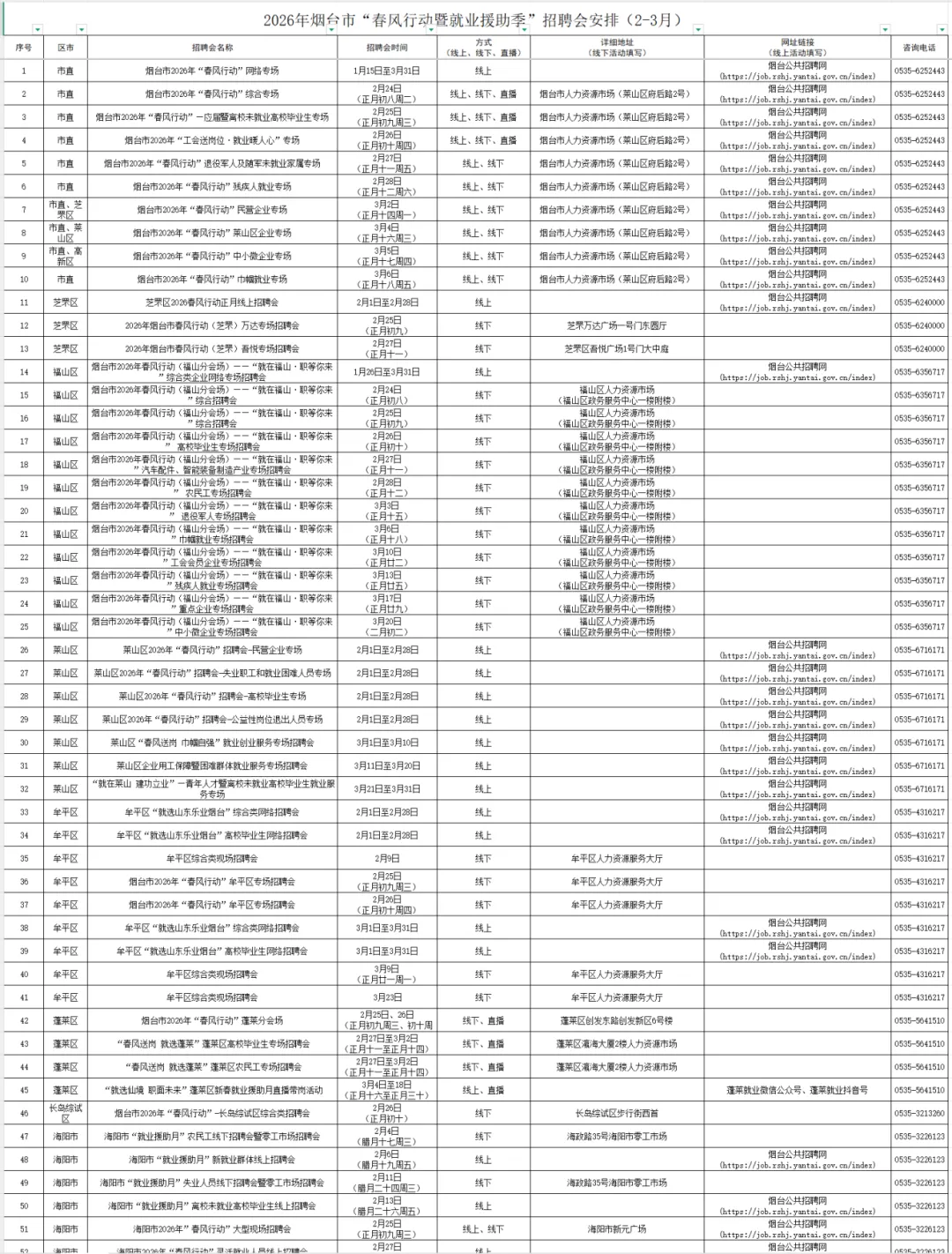 ✅时间场次:按照2026年“春风行动暨就业援助季”有关工作部署,为全力保障企业人才用工需求,促进高校毕业生、退役军人、失业职工等群体就业,烟台市人力资源和社会保障局计划于2026年2月至3月份,在全市范围内开展不少于106场次系列招聘活动。