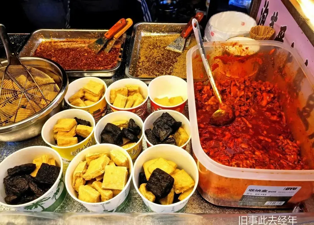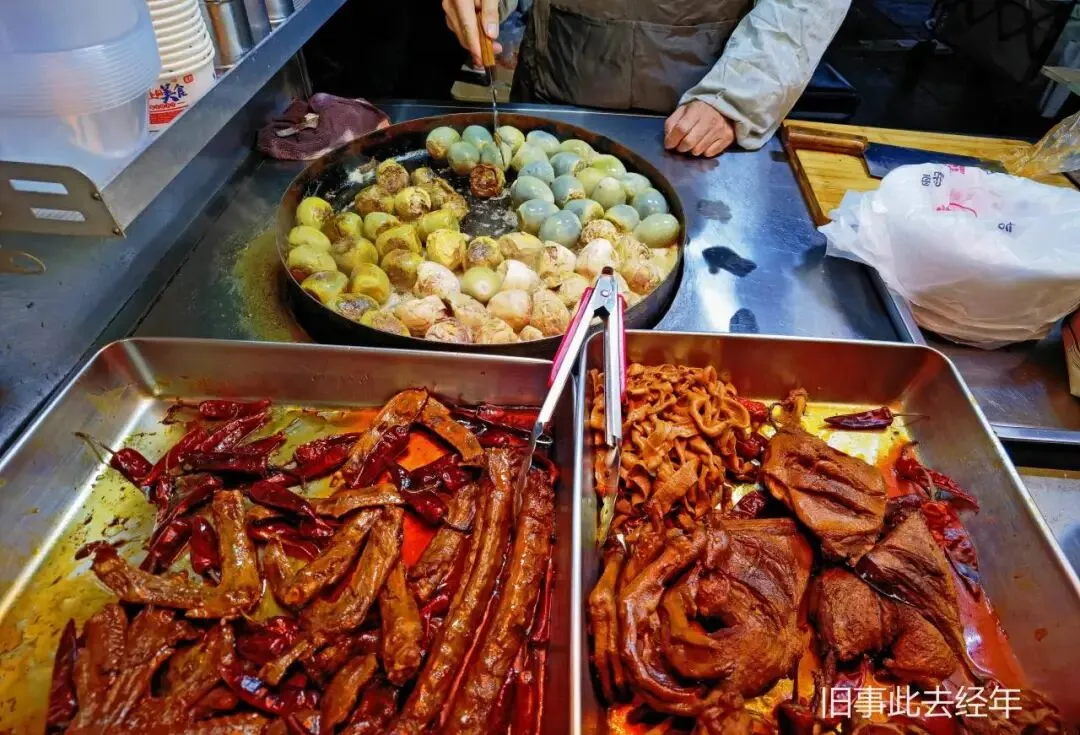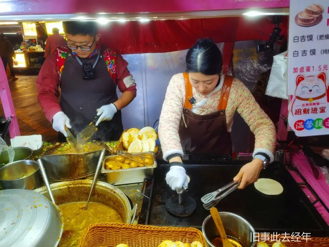 大锅卤菜摊支着大铁锅,荤素卤味齐全,卤汤浓郁,食材吸饱卤汁,实惠又入味,不少人逛完会顺带买些回家。臭豆腐闻臭吃香,外酥里嫩,浇上酱汁和泡菜,汁水四溢。烤面筋手工制作,炭火慢烤后刷上酱料,QQ弹弹、实惠解馋。鸡蛋汉堡,外酥里软,鸡蛋与肉末的鲜香交织,逛到最后来一个刚好垫饱肚子。