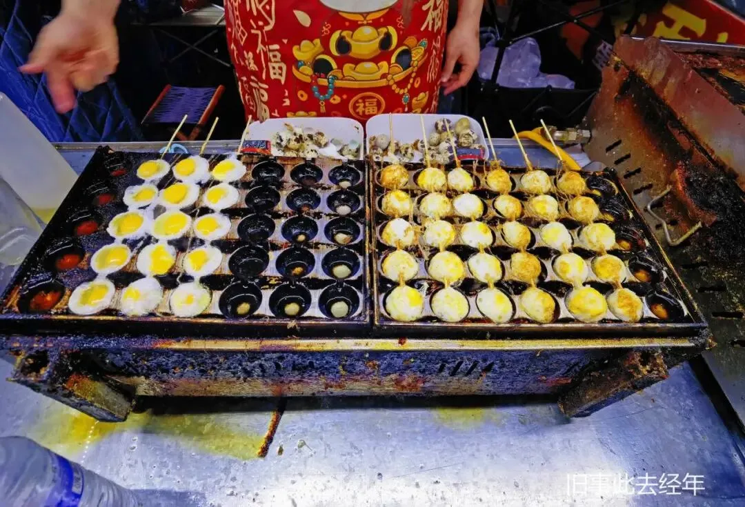 旁边焖面摊的大铁锅咕嘟冒泡,面条吸饱汤汁,裹着豆角与五花肉,软糯入味、实惠管饱。往前几步,鹌鹑蛋串煮得入味,刷上秘制酱汁,QQ弹弹,是孩子们的最爱。不远处的实蛋炸蝎子颇具特色,实蛋外酥里嫩,炸蝎子香脆可口,敢吃的人都夸解馋。