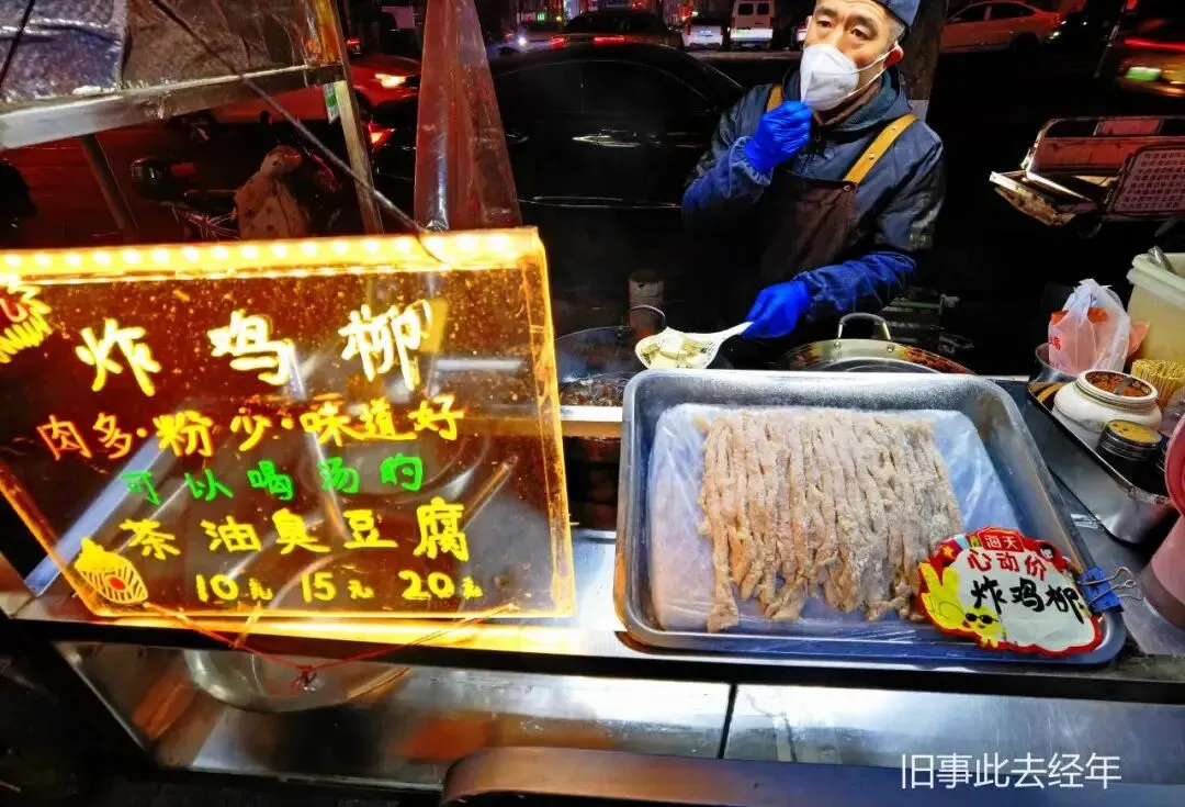 紧接着是网红临沂年糕,雪白软甜,糯叽叽还能拉丝。炸串摊种类齐全,金针菇、茄子等荤素串品,油炸后刷上酱料,分量足、性价比高。旁边炸鸡柳外酥里嫩,裹着薄薄面糊,是童年熟悉的味道。