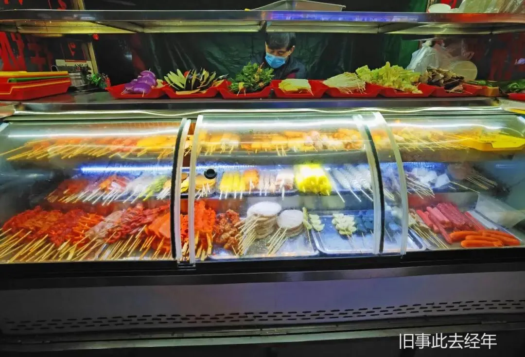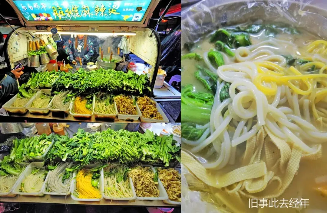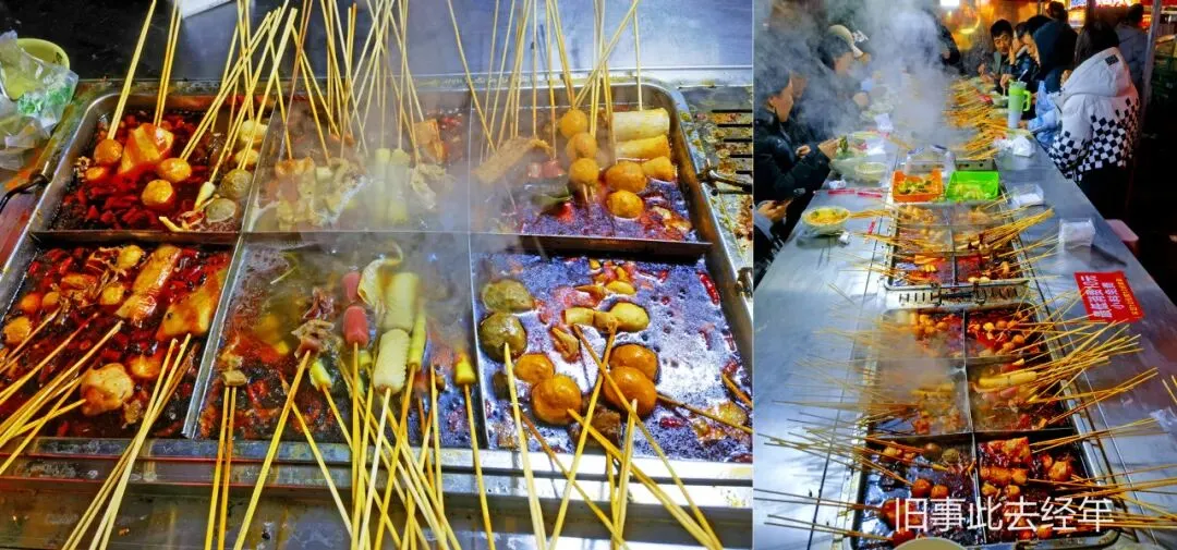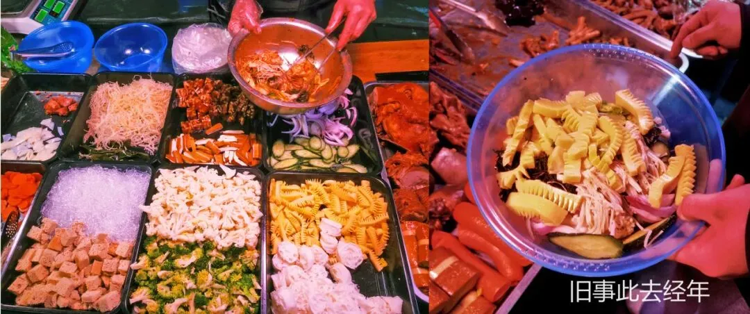 最实惠的当属涮串摊,各类串品琳琅满目,自行挑选涮熟的串,蘸上麻酱调料,鲜香可口爽辣过瘾。挨着的东北黏糊麻辣烫,浓麻酱裹着粉条青菜,咸香微麻,越吃越上头。背后的大拌菜新鲜清爽,浇上秘制凉拌汁搅拌后,解腻又爽口。