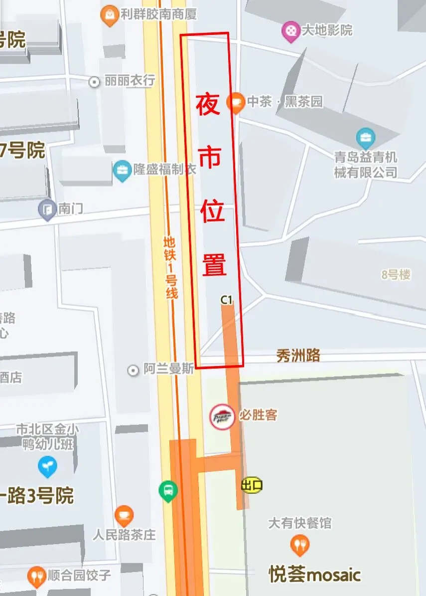 位于地铁1号线小村庄站的悦荟夜市,地处四方区的闹市核心地段,背靠悦荟购物广场与四方利群两大商圈,面朝车水马龙的人民路,地理位置得天独厚。傍晚五点多,天刚擦黑,这里便热闹起来。没有华丽招牌与精致装修,百余个摊位沿街整齐摆开,简易铁架棚挂着普通LED灯,昏黄灯光将夜市照亮,食物香气与不远处商场霓虹交相辉映,也吸引着地铁口出来的过往食客。