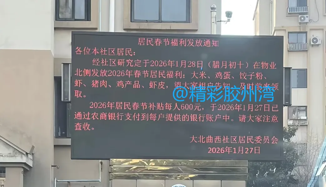 2026年居民春节补贴每人600元,于2026年1月27日已通过农商银行支付到每户提供的银行账户中。请大家注意查收。