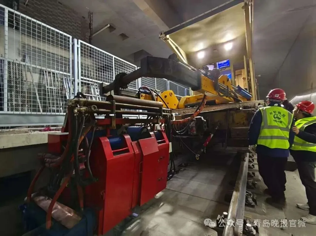今天,青岛地铁2号线二期工程龙川路站隧道里,新投用的新能源焊轨机将两根25米长的60型标准轨精准对接,完成项目首对钢轨焊接,标志着青岛地铁三期线路首个铺轨工程进入焊轨阶段。