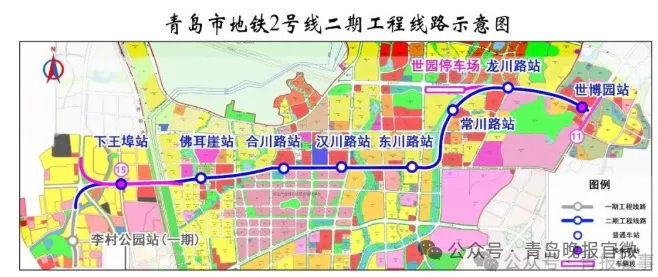 2号线二期工程全长8.9公里,西接2号线一期李村公园站,自站后折返线引出后,沿夏庄路北上穿越下王埠立交桥,再沿金水路向东敷设,途经下王埠、青银高速、佛耳崖、臧村、李家上流等重要区域,随后沿常川路北行,拐入世园大道向东敷设,最终在东端世博园站与已运营的蓝谷快线实现换乘,设置下王埠、佛耳崖等8座车站。通车后,将极大优化李沧东部及崂山中部区域交通网络布局,实现与主城区15分钟快速通达,惠及沿线近10万居民。